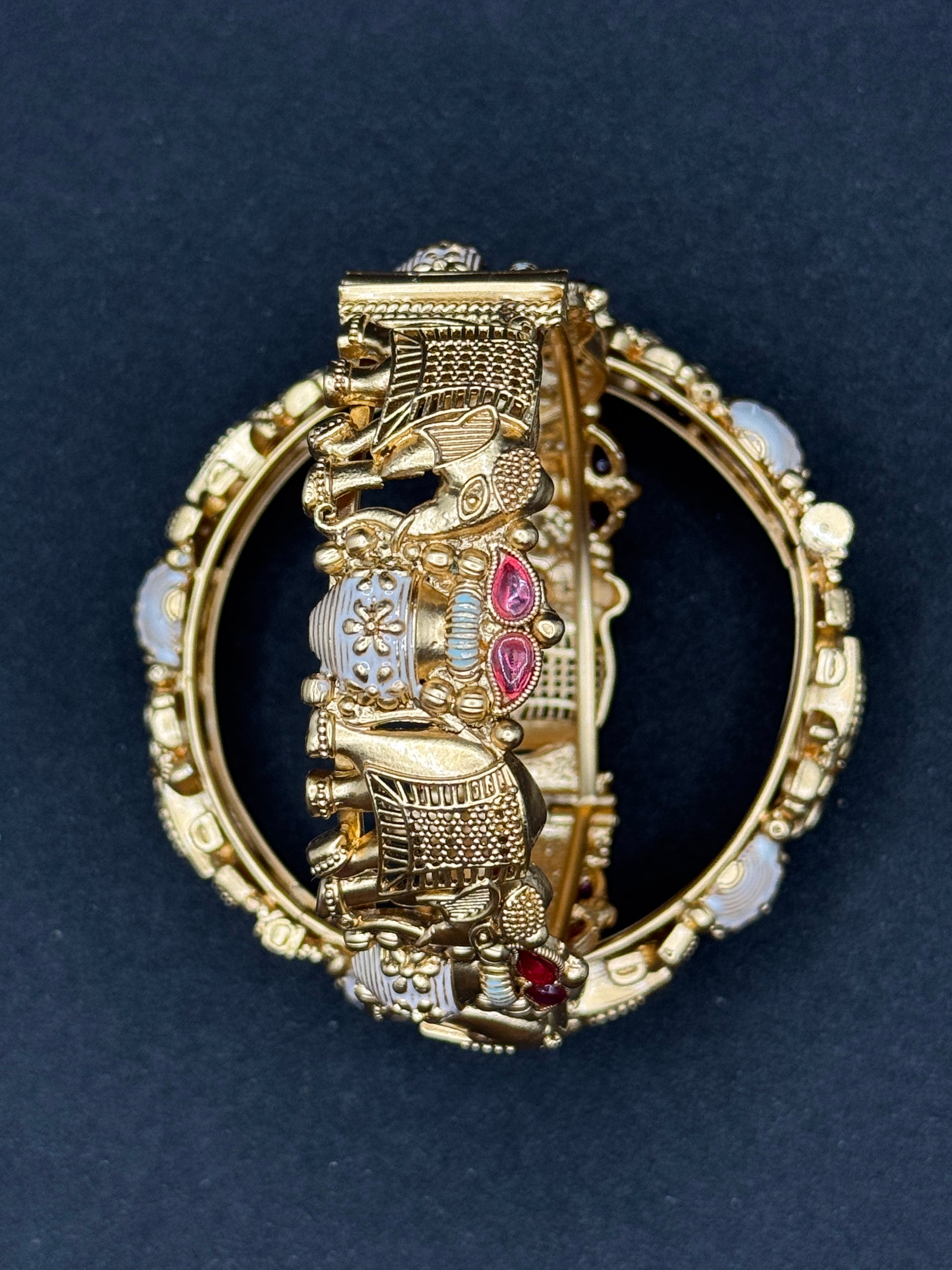 A pair of antique gold-plated bangles with intricate elephant motifs and traditional Indian designs, accented with red stones, offering a regal and timeless appeal.