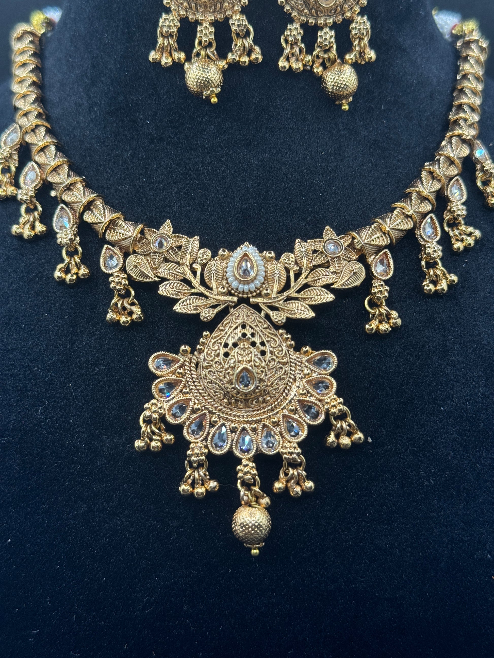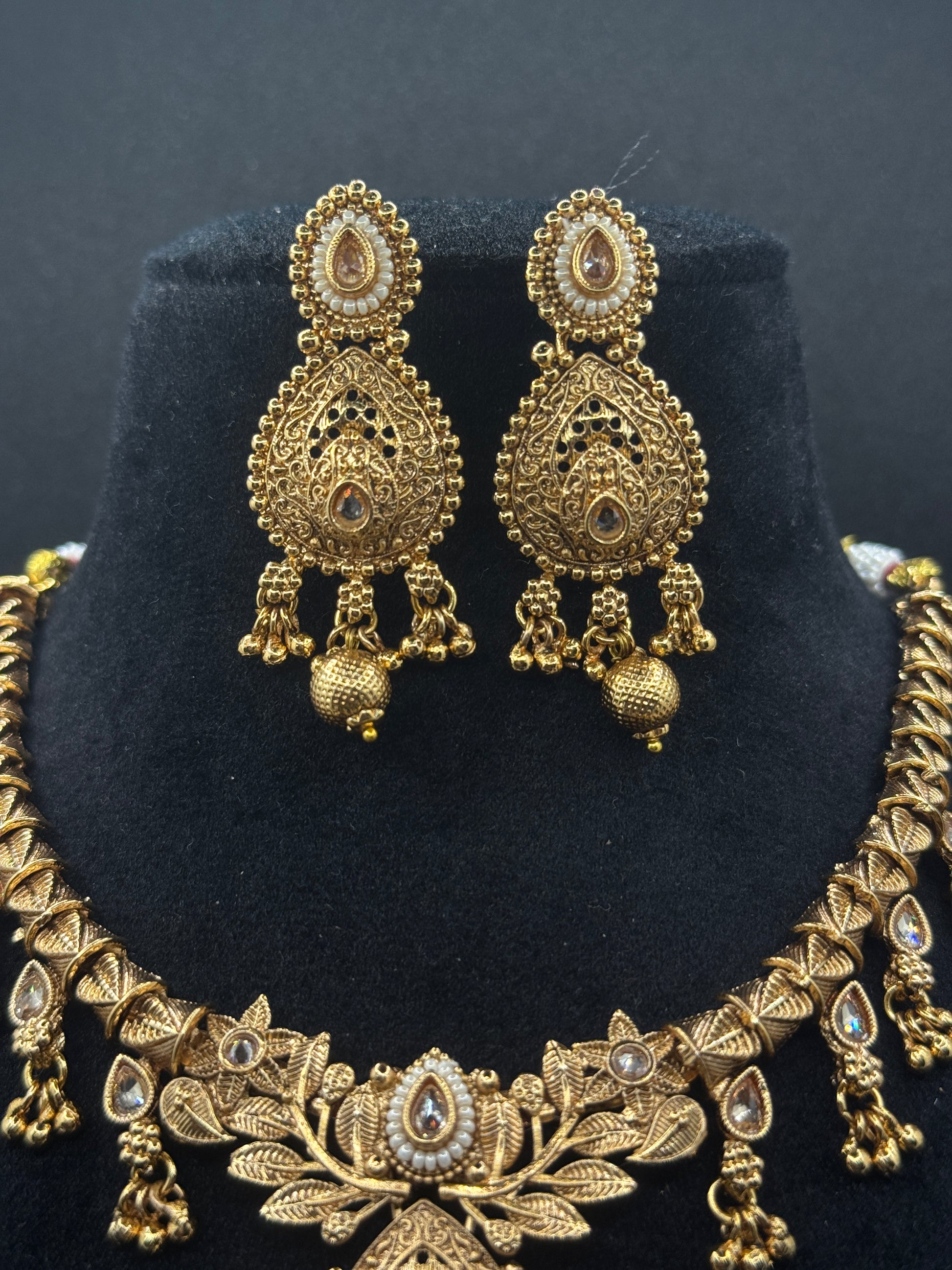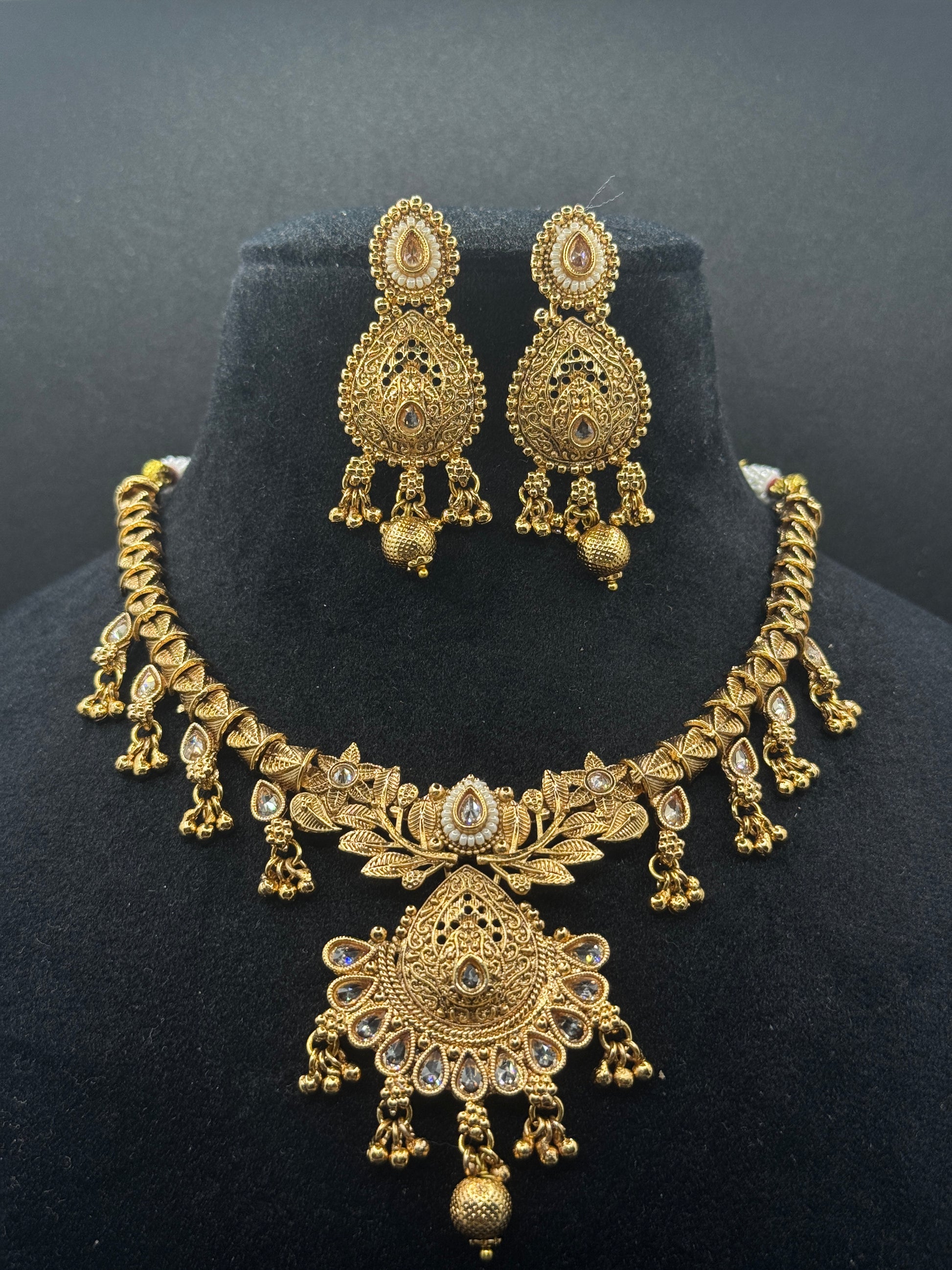 An exquisite antique gold-plated necklace set inspired by temple jewelry designs. The necklace features a prominent Lakshmiji and peacock motif pendant, adorned with polki, ruby, and green stones, accompanied by matching jhumka-style earrings.