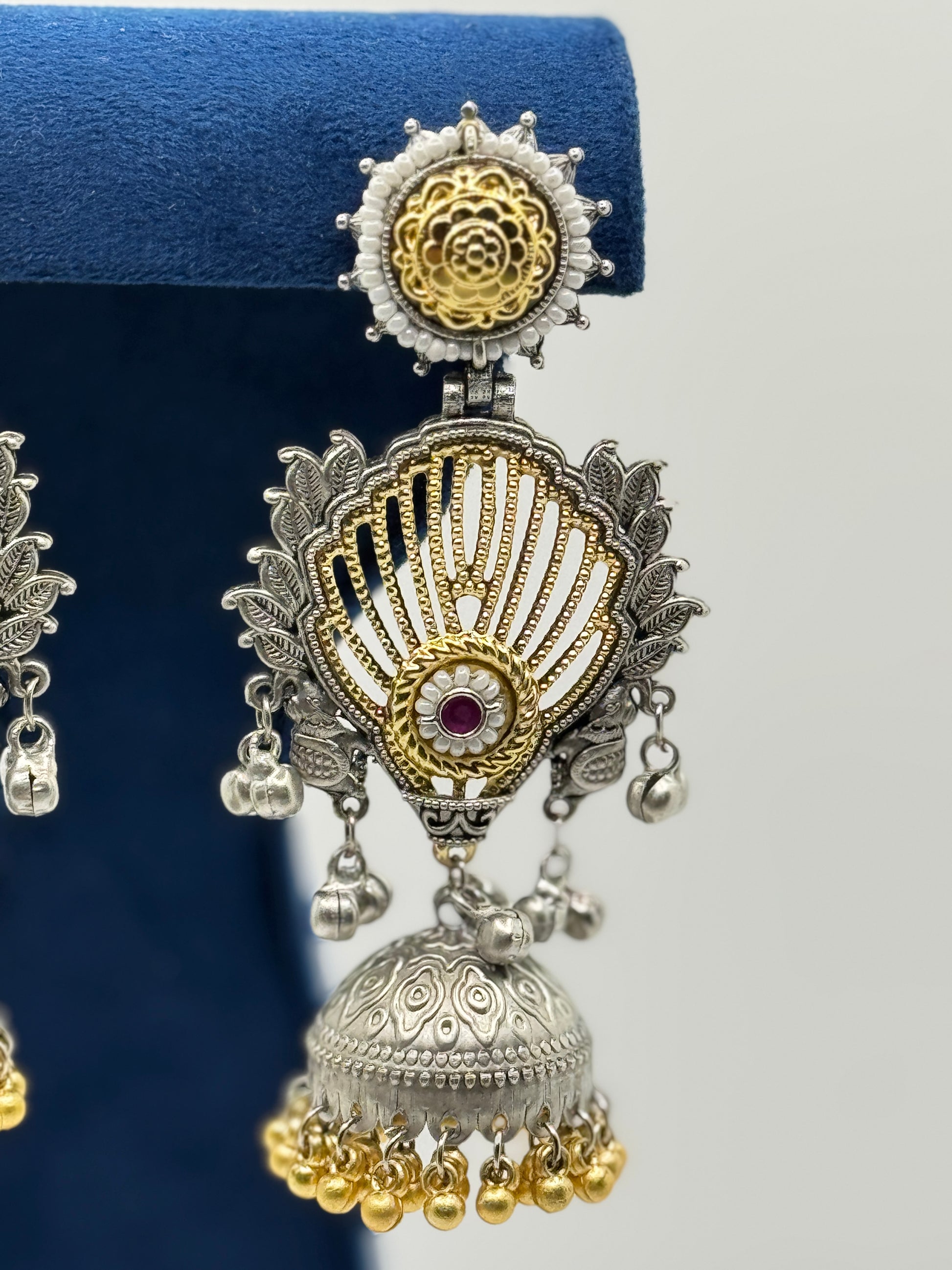 Blue Stone Fan-Design Dual-Tone Jhumkas