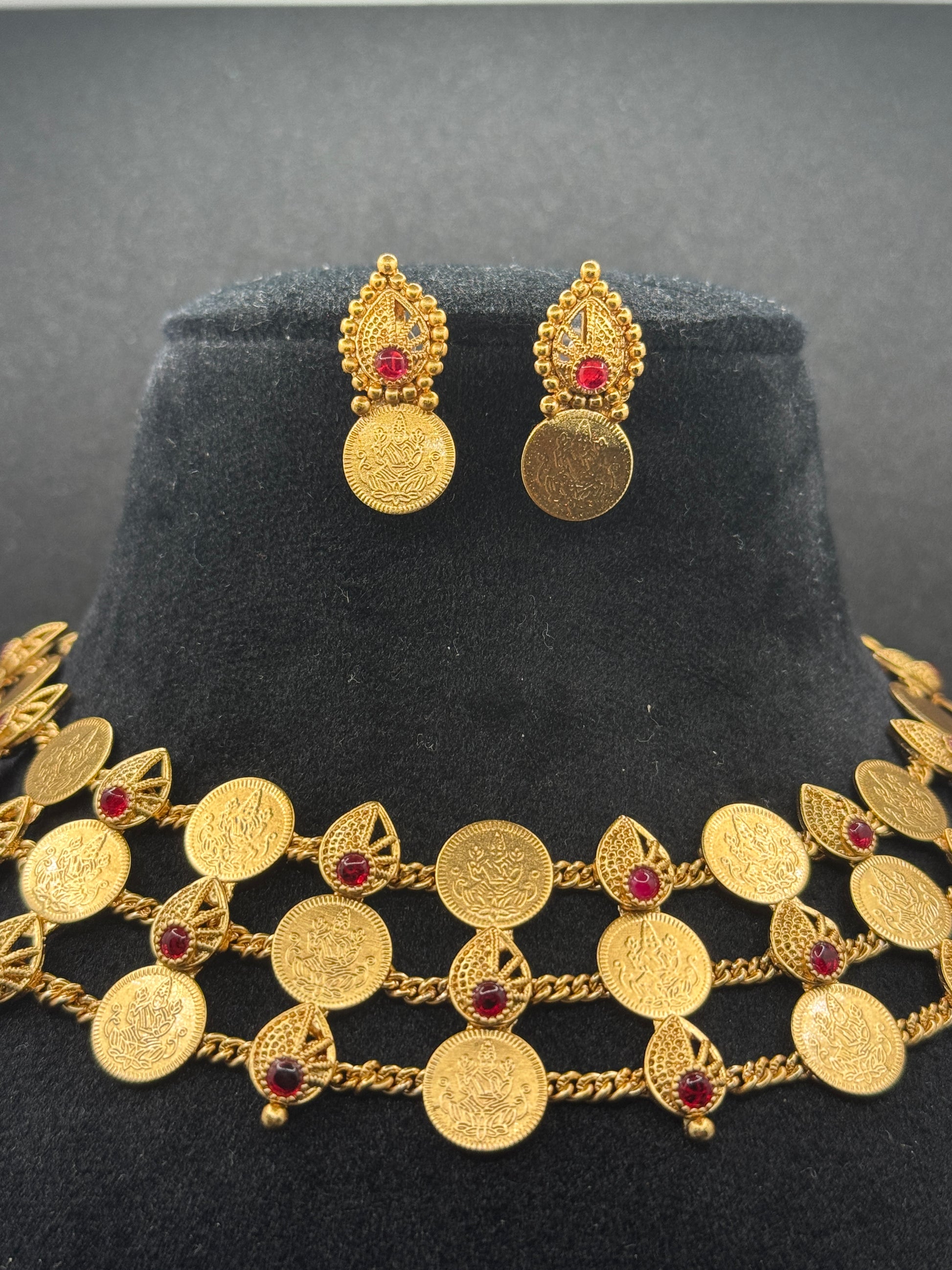This charming gold-plated choker features multiple rows of intricate coin motifs, enhanced with dazzling ruby red stones. The accompanying earrings with similar coin and stone detailing create a cohesive and elegant look.