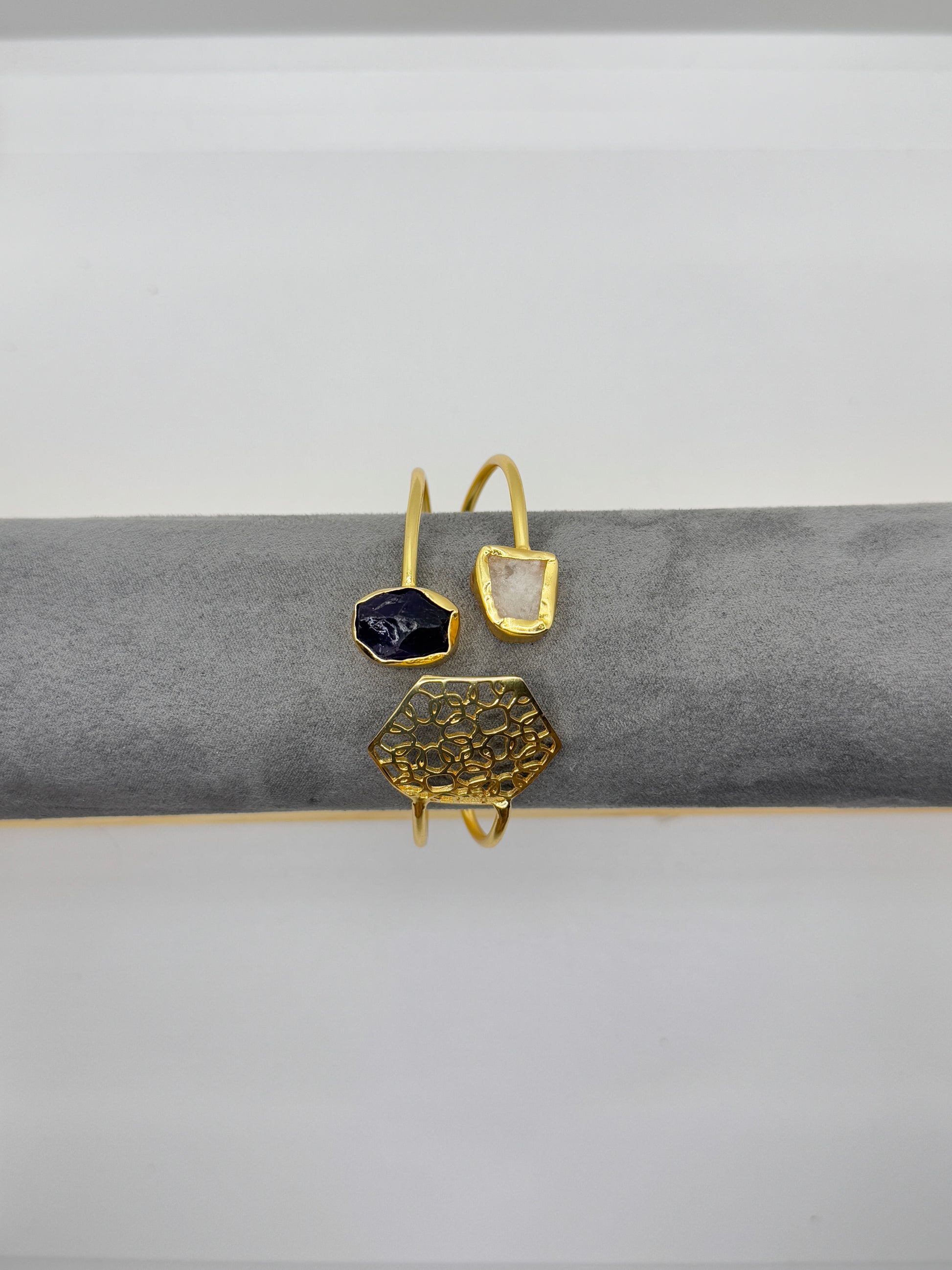 Inspired by nature’s perfect geometry, the Dual Aura Hex Cuff Bracelet showcases a striking open hexagonal motif in radiant gold finish, symbolizing harmony and strength. It is adorned with two raw-cut gemstones on either end—each uniquely colored to embody dual energies. The vibrant orange and smoky quartz-like tones add a bold contrast to the intricate honeycomb design, making this cuff a true statement piece. Perfect for styling solo or layering with your favorite bangles for a contemporary mythical charm.