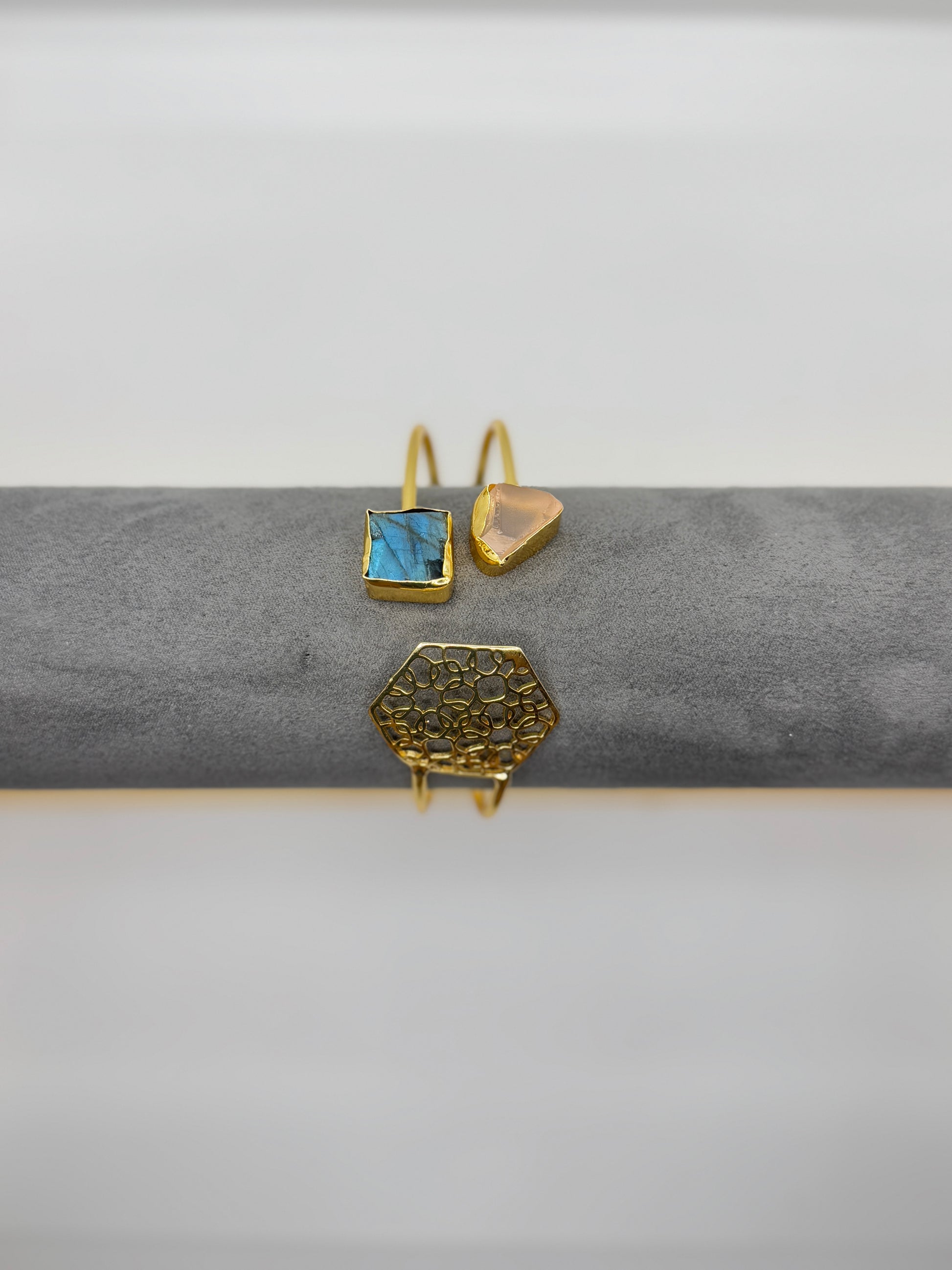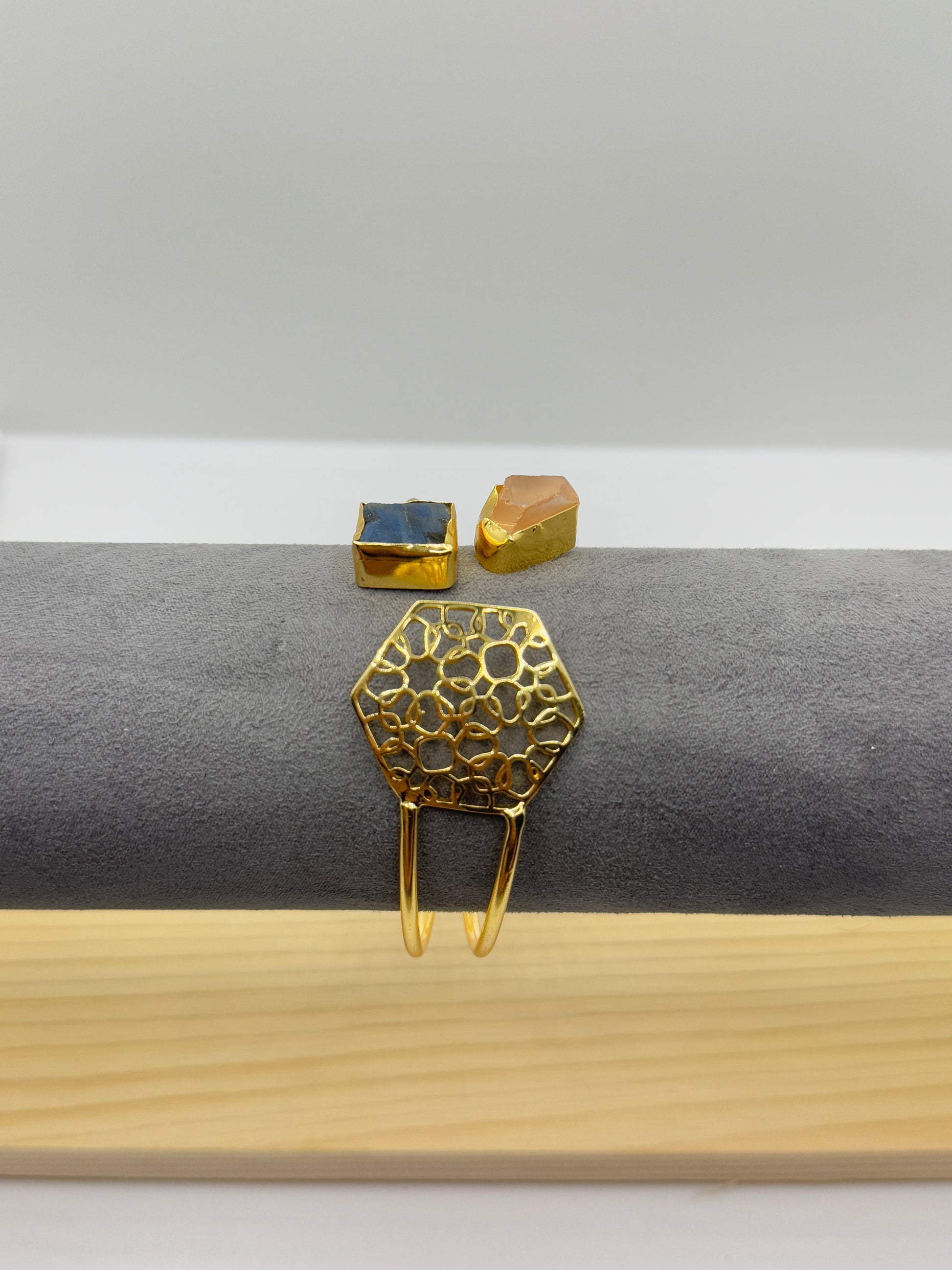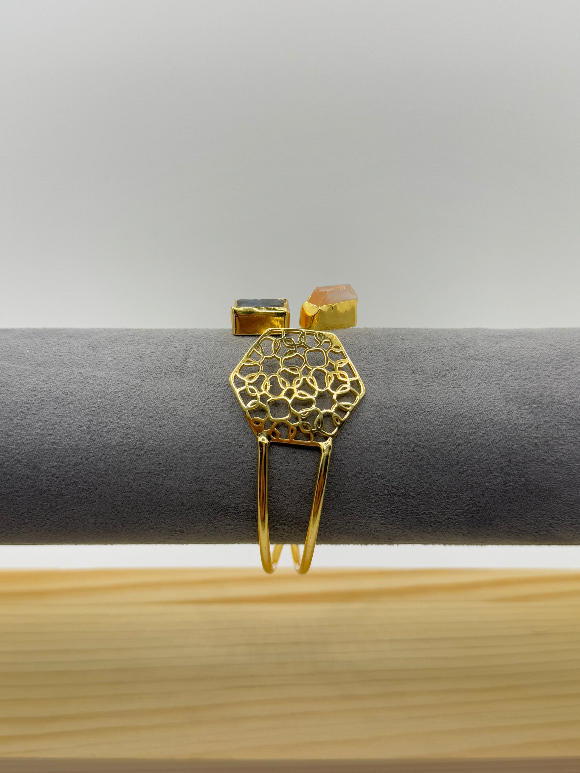 Inspired by nature’s perfect geometry, the Dual Aura Hex Cuff Bracelet showcases a striking open hexagonal motif in radiant gold finish, symbolizing harmony and strength. It is adorned with two raw-cut gemstones on either end—each uniquely colored to embody dual energies. The vibrant orange and smoky quartz-like tones add a bold contrast to the intricate honeycomb design, making this cuff a true statement piece. Perfect for styling solo or layering with your favorite bangles for a contemporary mythical charm.