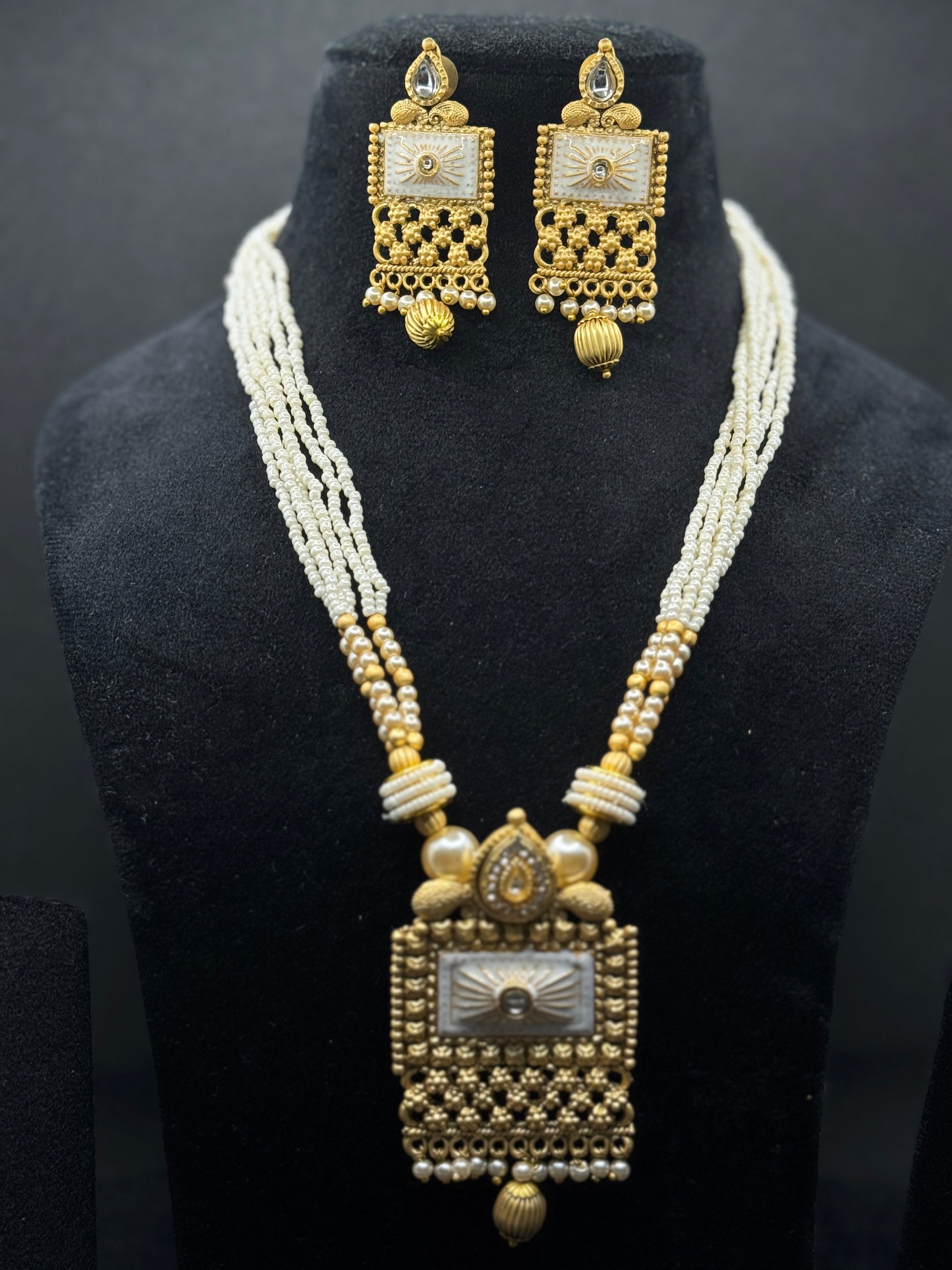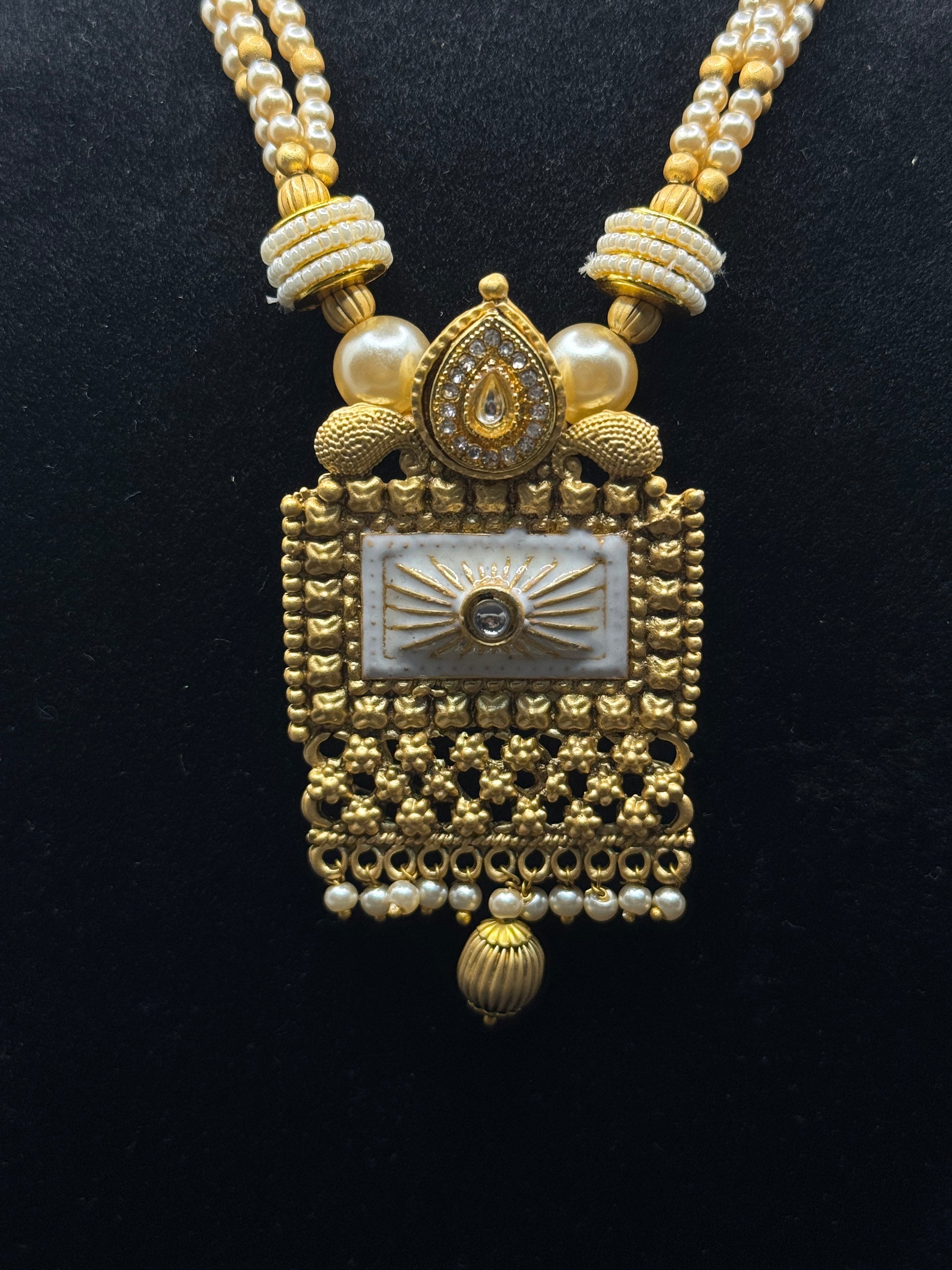 This long necklace set showcases a beautiful matte gold finish with intricate Meena work in a Rajwadi temple design. Multiple strands of lustrous pearls add a touch of sophistication, making it ideal for grand celebrations.