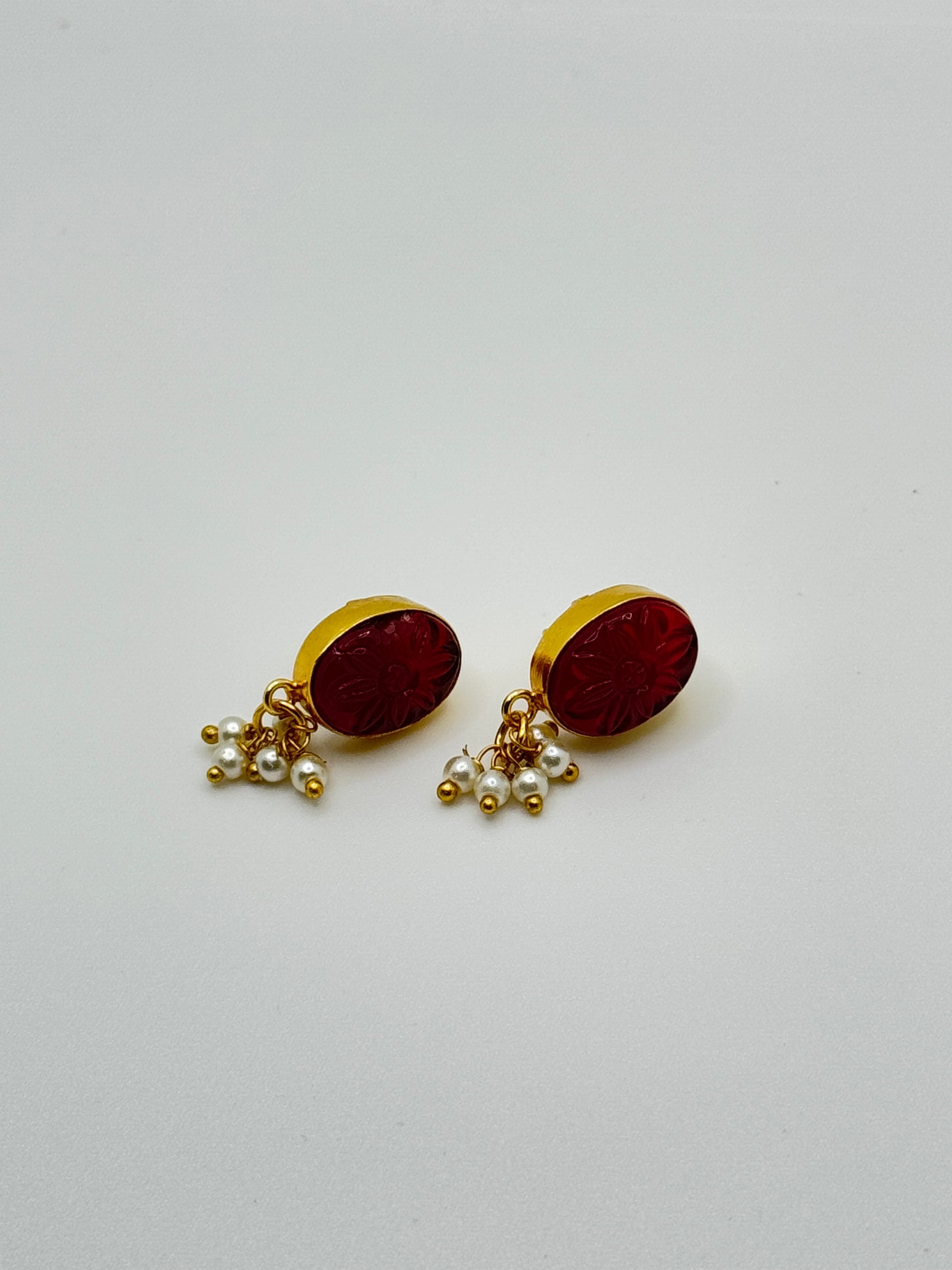 Gold Carved Red Gemstone Drop Earrings with Pearls