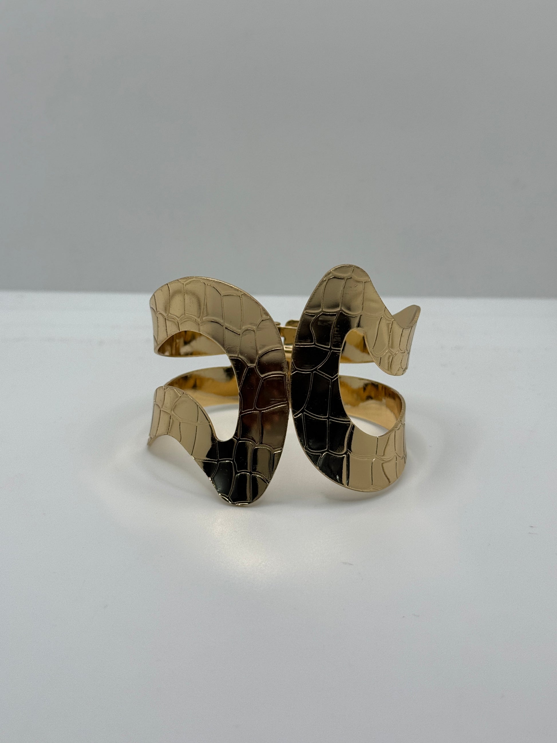 Gold Cuff Bracelet with a Cut-out Wavy Design and a Crocodile Skin Texture