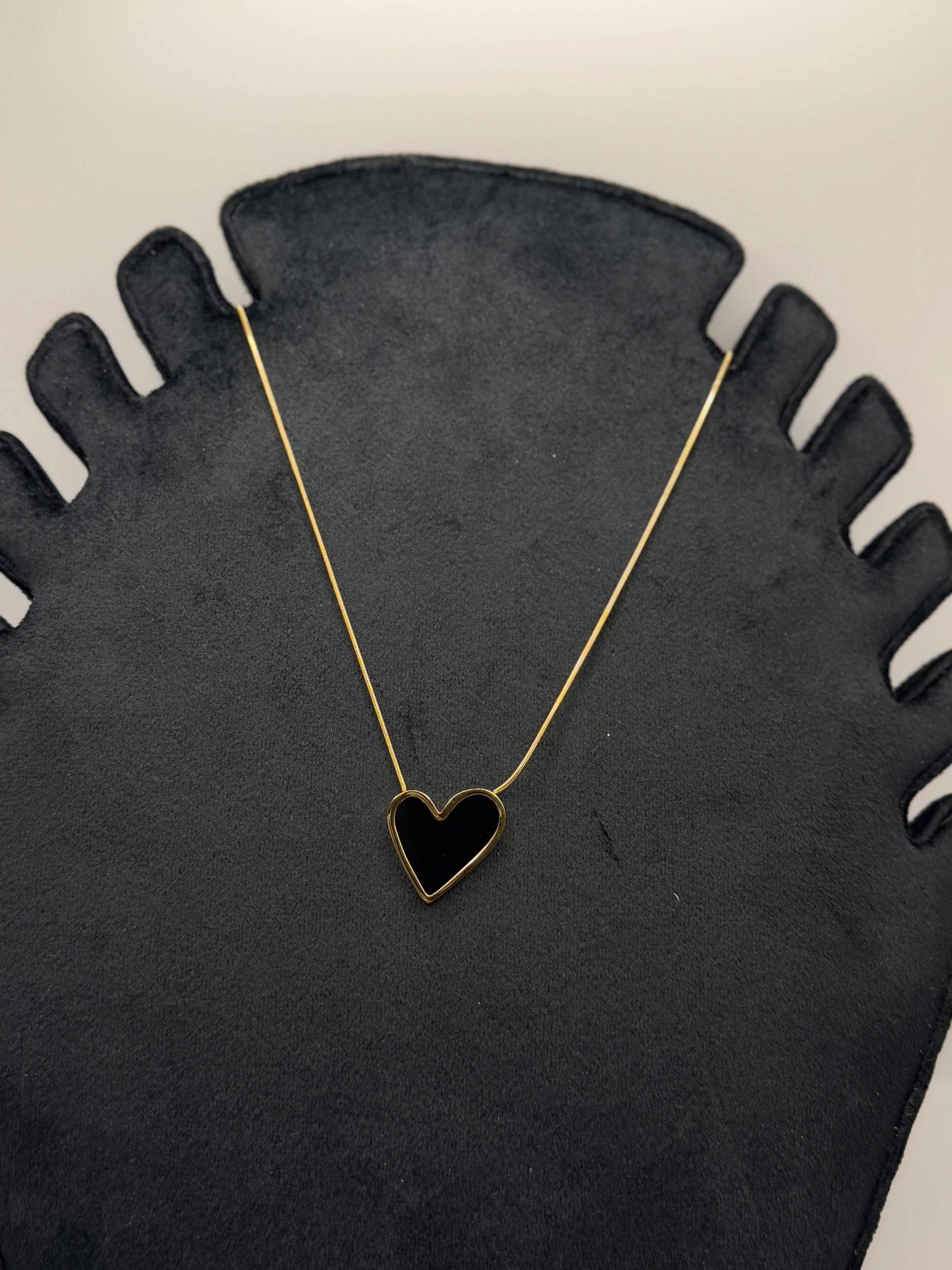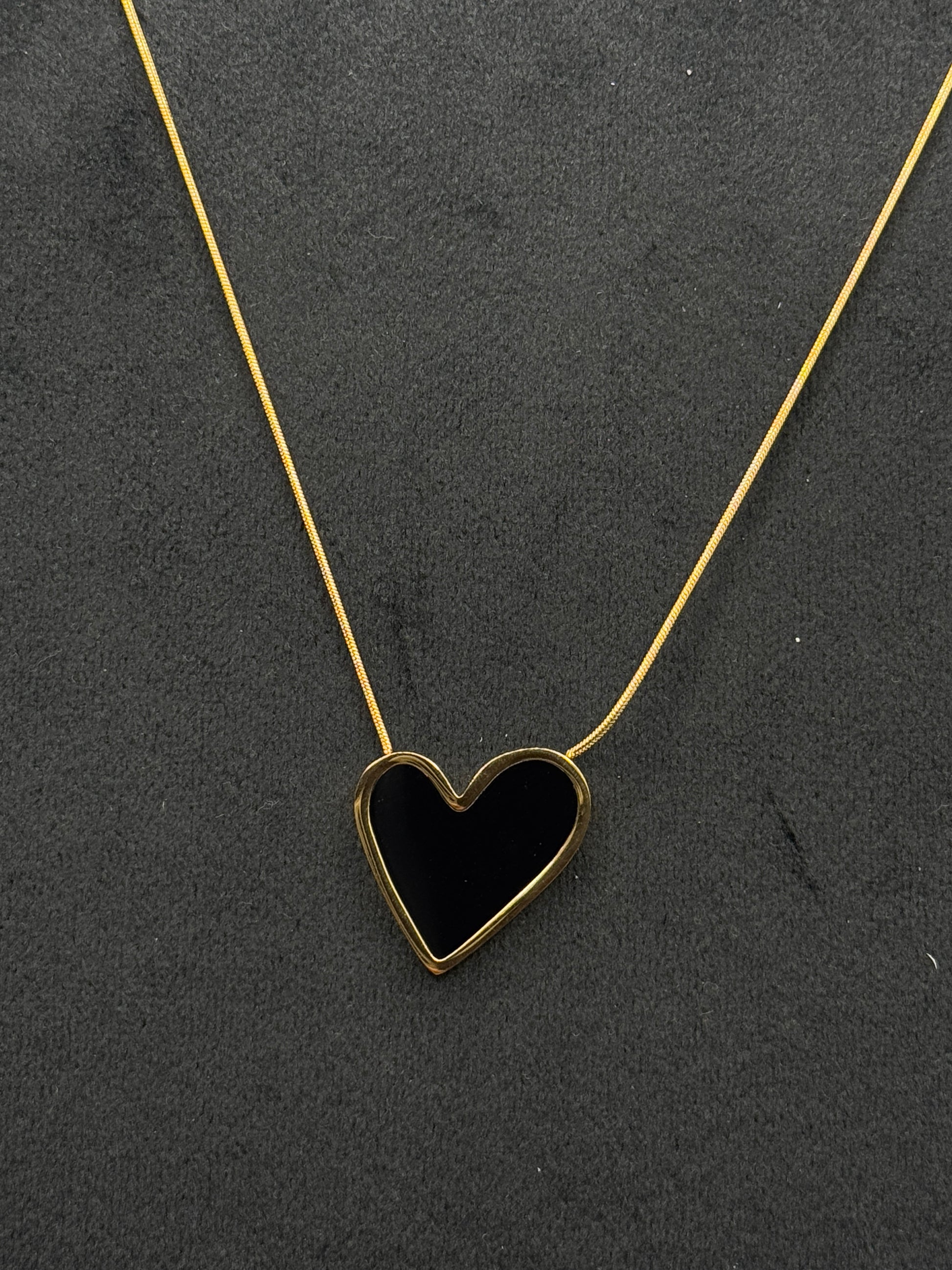 This charming gold-tone necklace features a delicate chain suspending a heart-shaped pendant. The pendant has a subtle gold outline framing a sleek, dark black inlay, creating a modern and romantic accessory.
