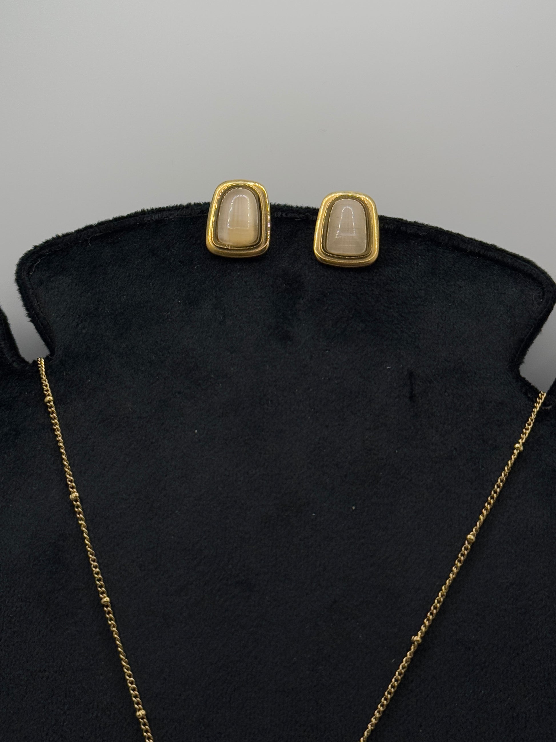 A matching gold-tone jewelry set consisting of a necklace with a rectangular pendant and complementing stud earrings. Both pieces feature a smooth, rounded gold frame enclosing a polished, creamy ivory-colored inlay, offering a sophisticated and cohesive look.
