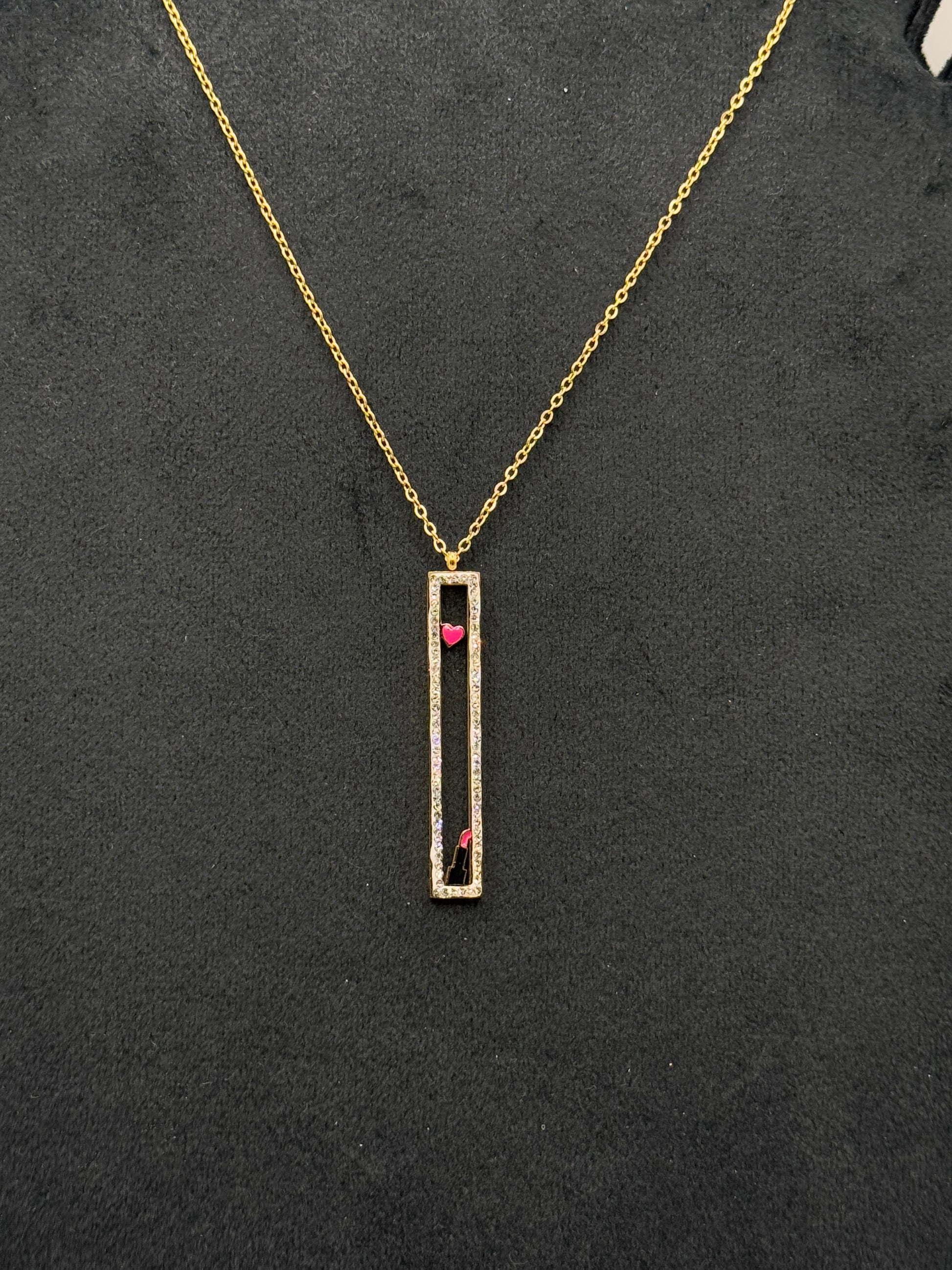 A modern gold-tone necklace featuring a rectangular bar pendant. The pendant is open in the center and adorned with sparkling clear stones along its edges, with small red or pink accent stones within the opening, creating a chic and contemporary design.