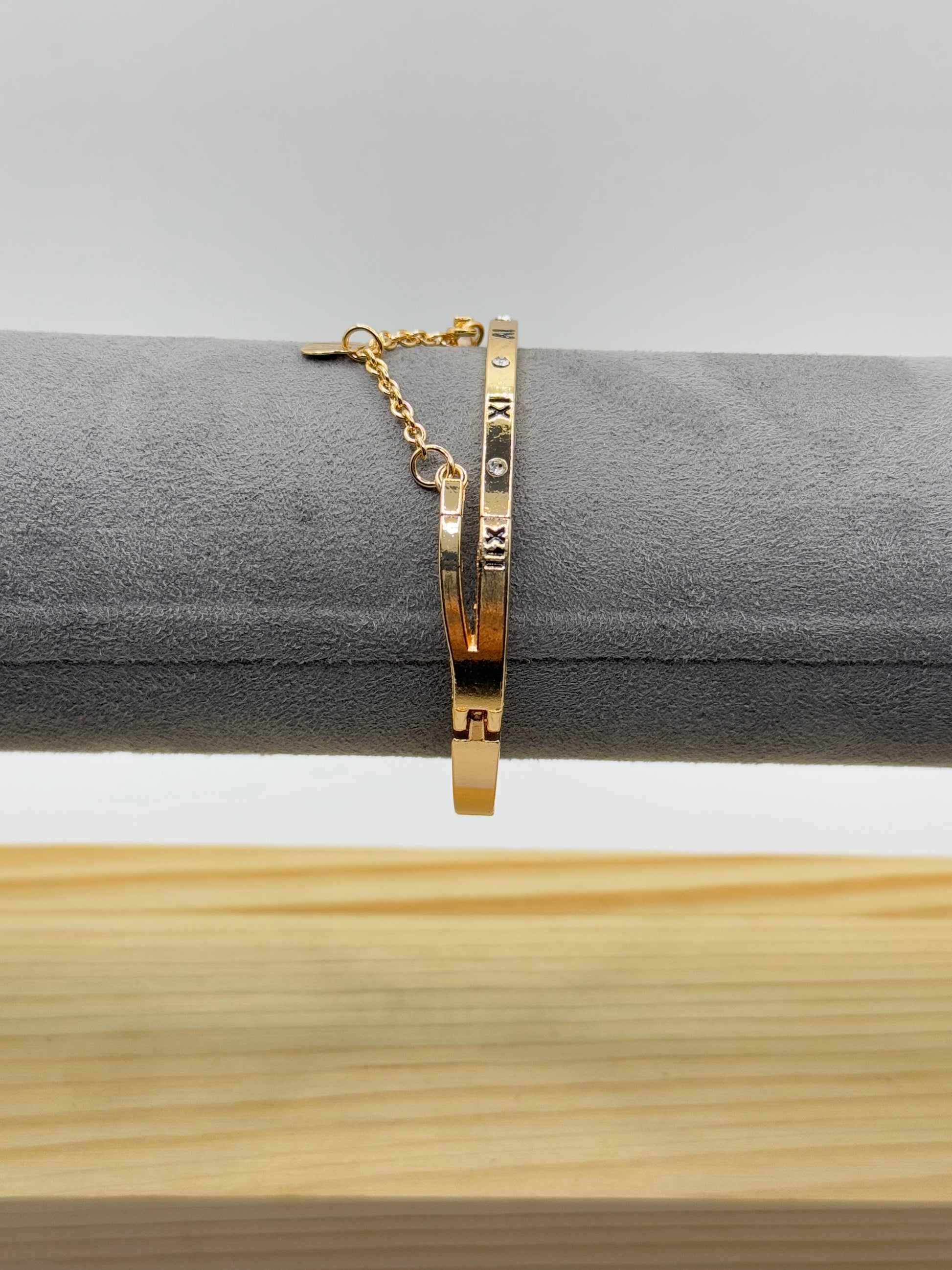 This chic gold-tone bangle bracelet features engraved Roman numerals and sparkling clear stone accents. It is further enhanced by a delicate chain with a small heart-shaped charm, combining classic and romantic elements.