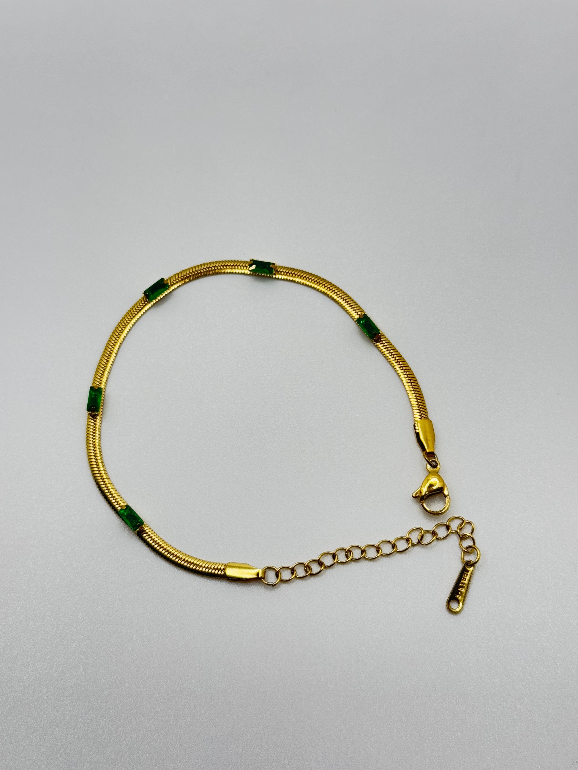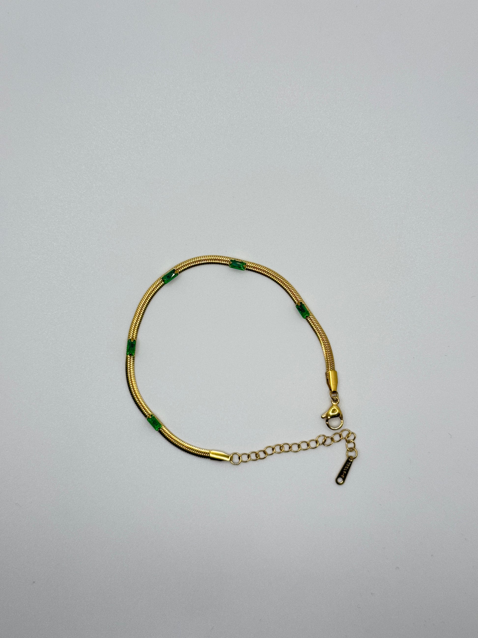 This elegant gold-tone snake chain bracelet is accented with rectangular green inlays or stones at regular intervals. The combination of the smooth gold and the vibrant green creates a sleek and contemporary design.