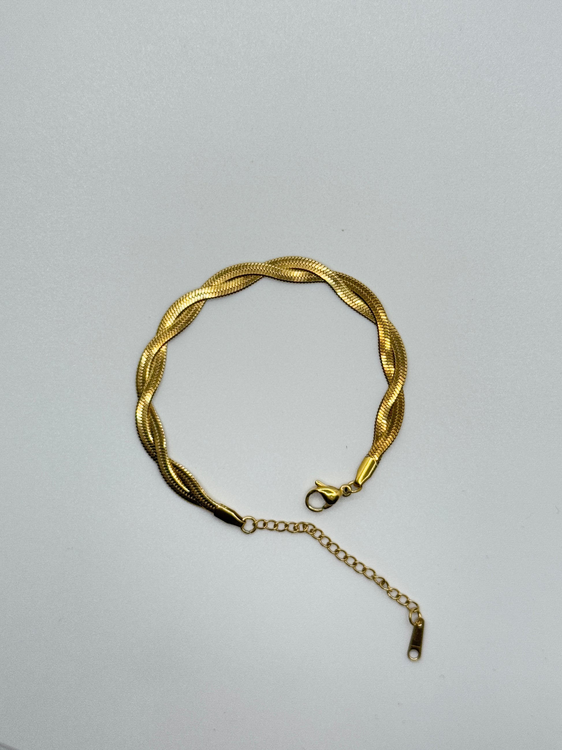 This stylish gold-tone bracelet features a unique twisted herringbone design, creating a fluid and elegant look. It's a contemporary piece that adds a touch of sophistication to any wrist.