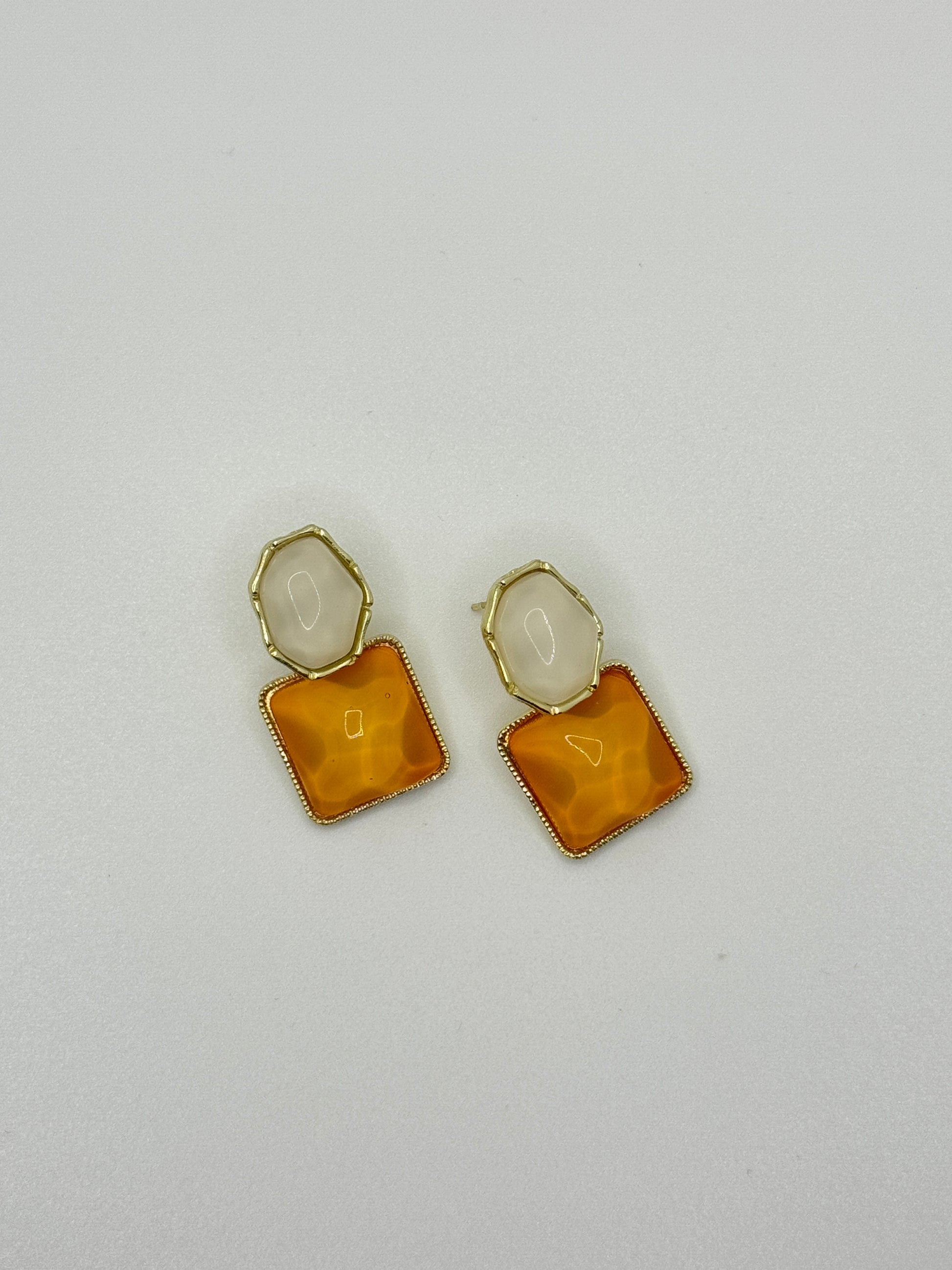 Elevate your style with these stunning gold-toned drop earrings, featuring a chic dual-stone design. Each earring showcases a faceted, irregular-shaped upper stone gracefully paired with a sleek square-shaped lower stone, both set in a lustrous gold-toned frame.