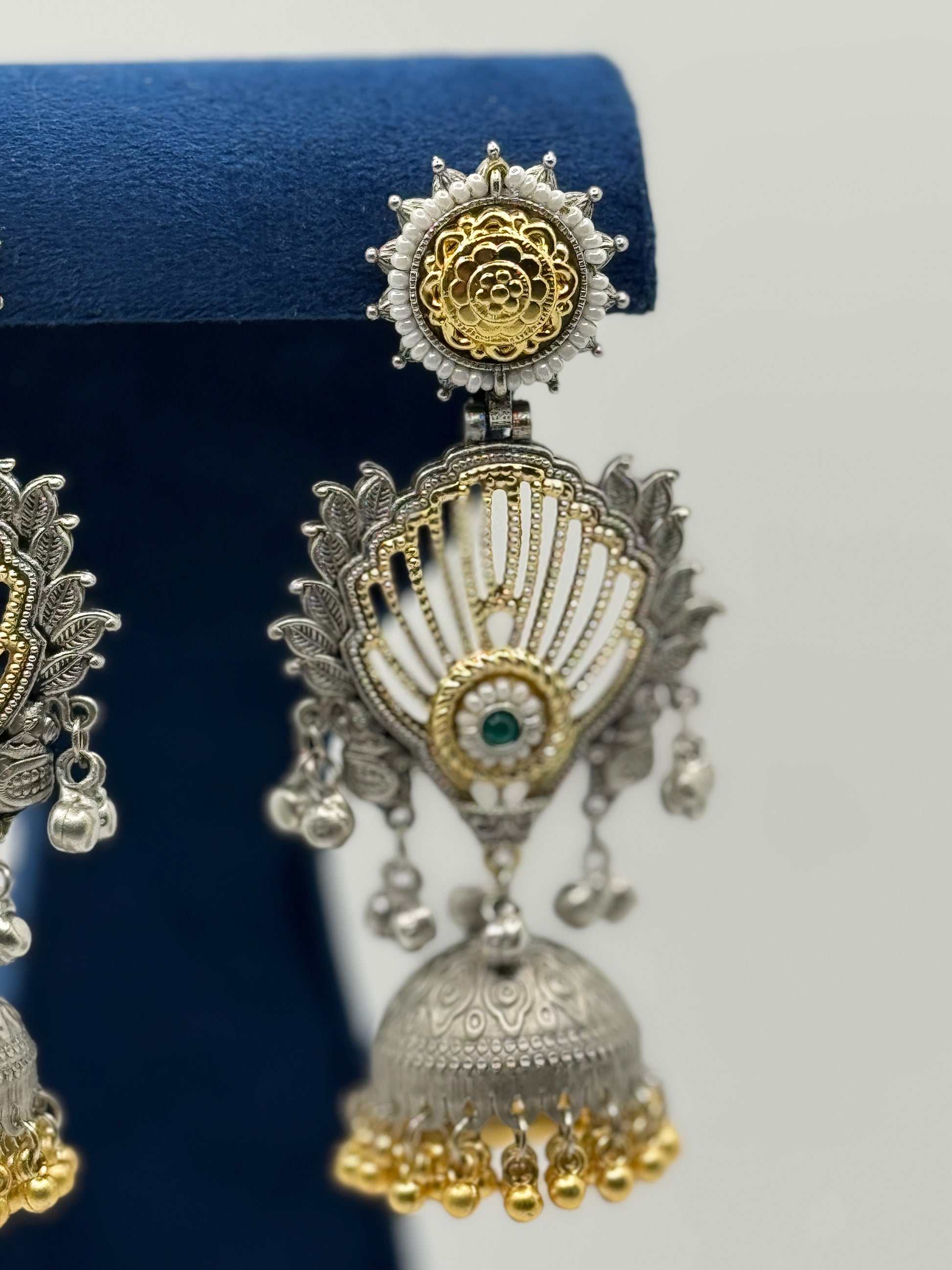 Green Stone Fan-Design Dual-Tone Jhumkas