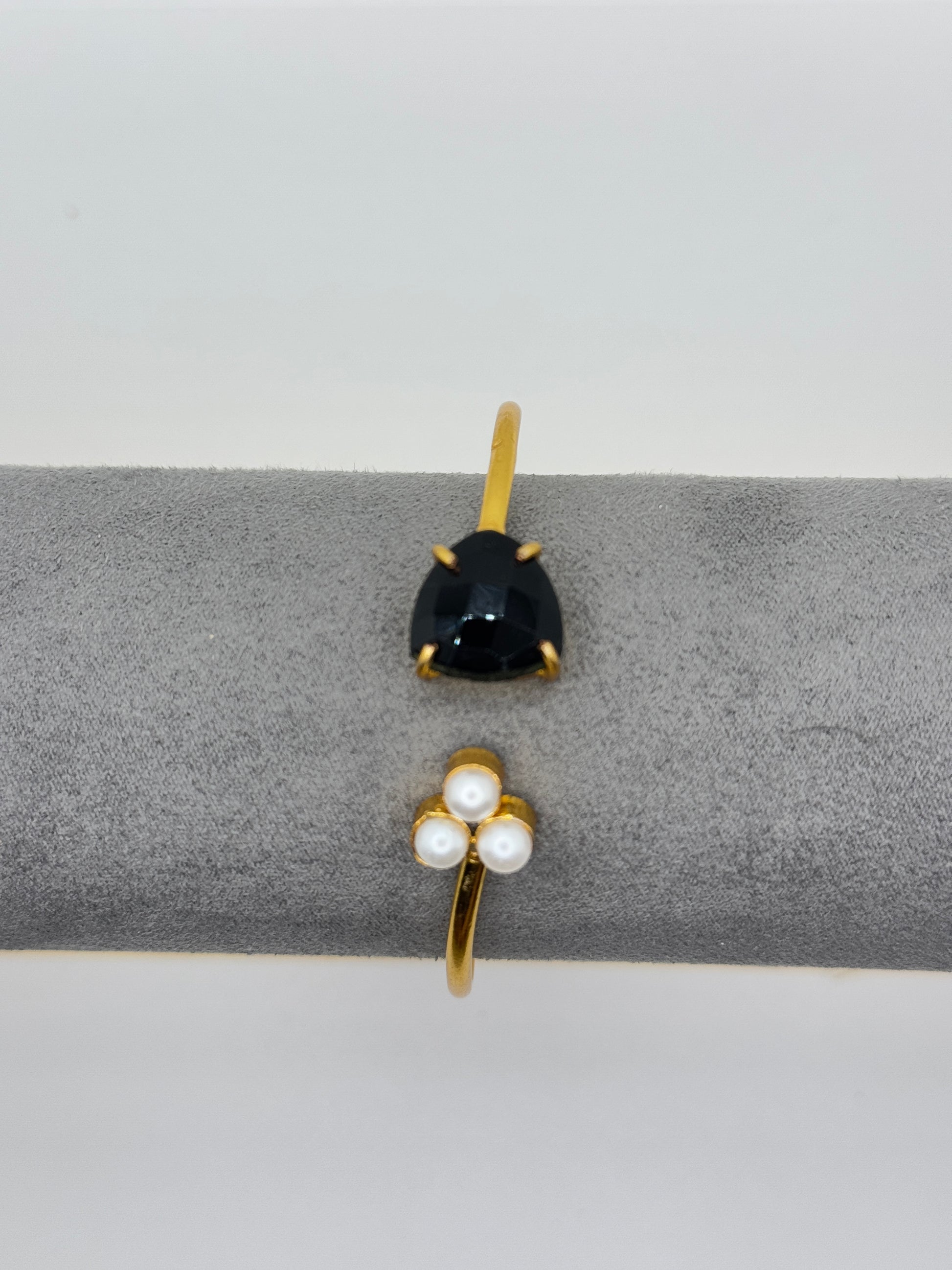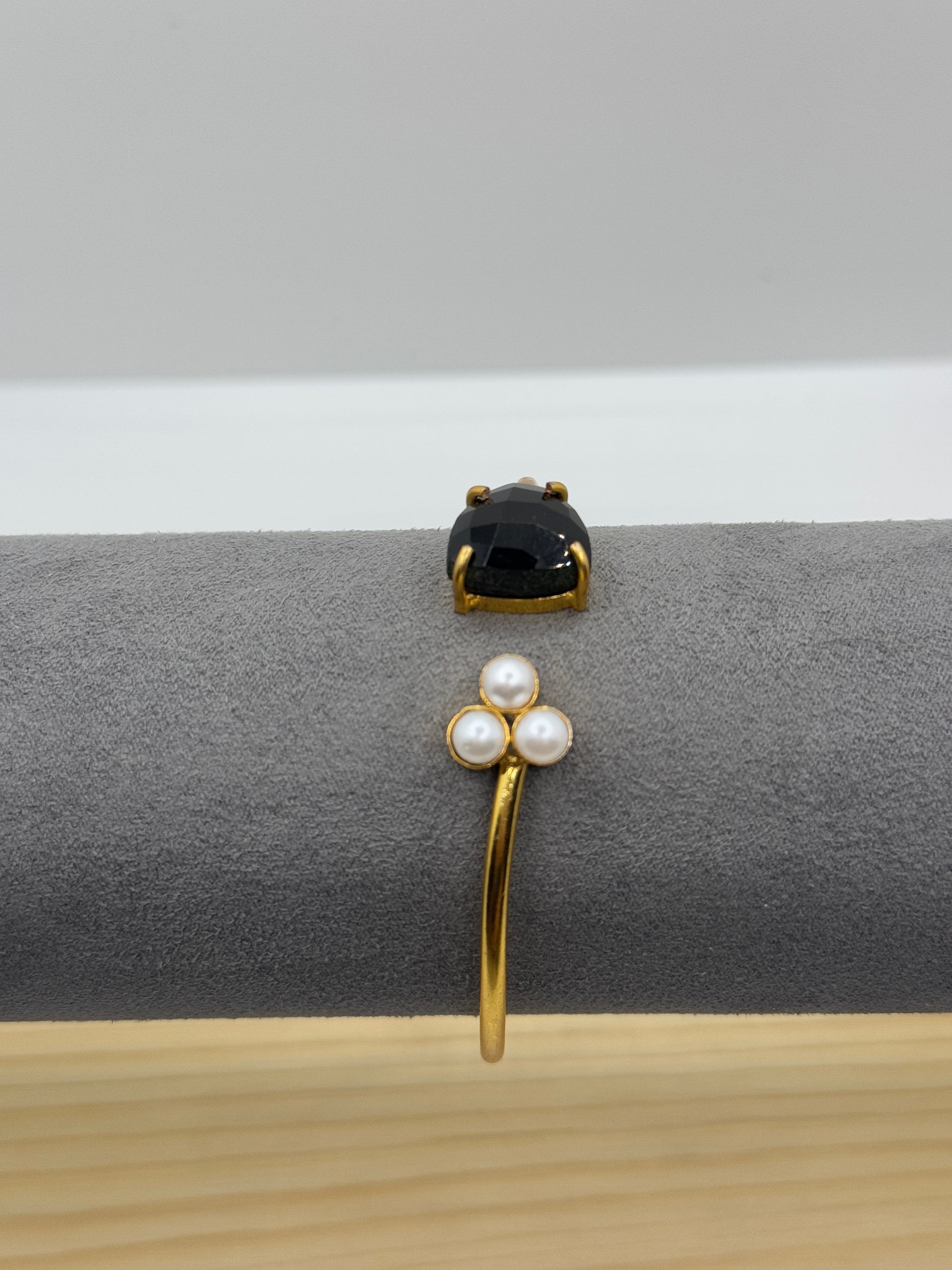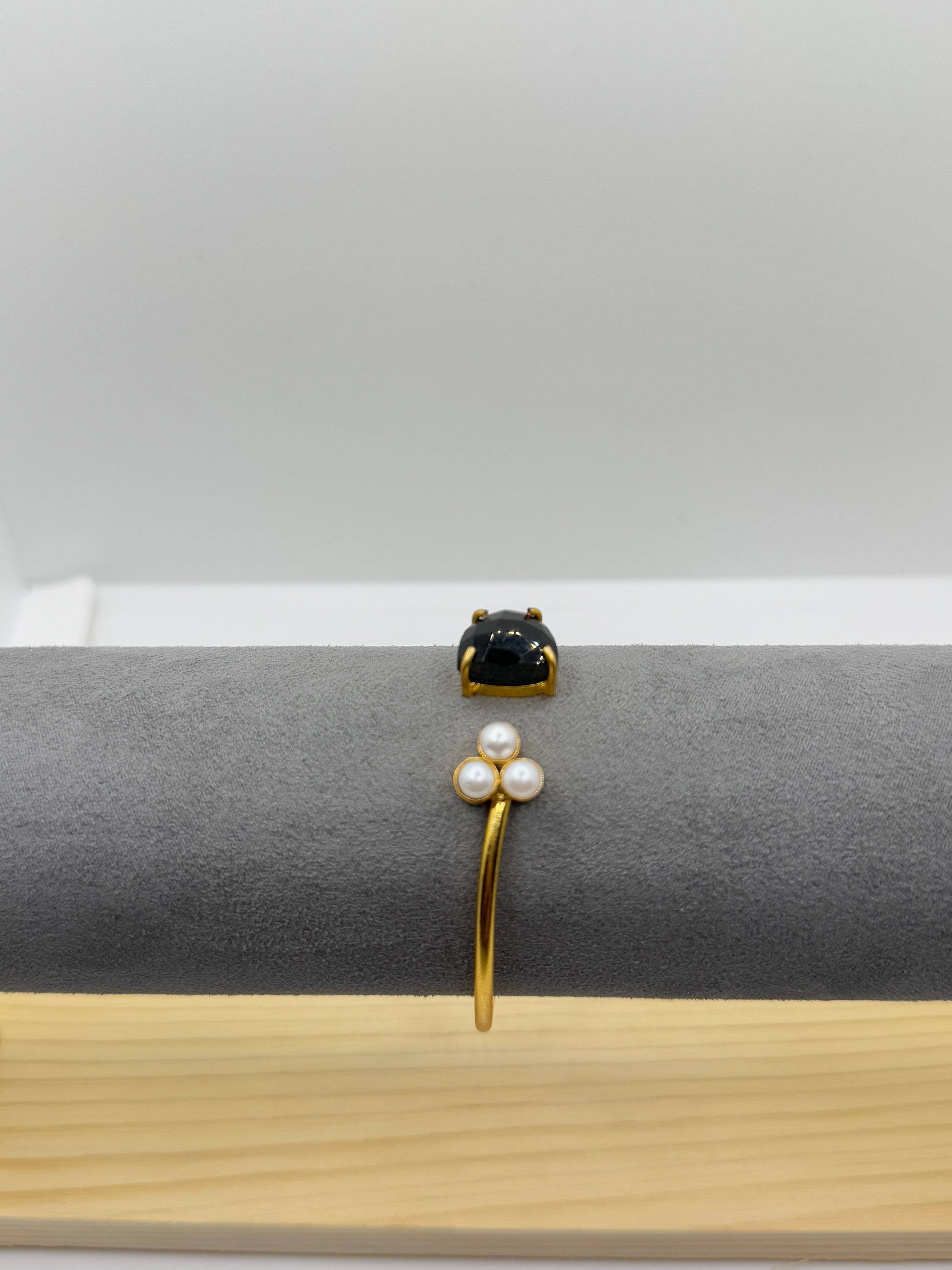 A unique open-style gold bangle featuring a striking black teardrop-shaped gemstone on one end and a cluster of three small white pearls on the other, artfully displayed on a grey stand.