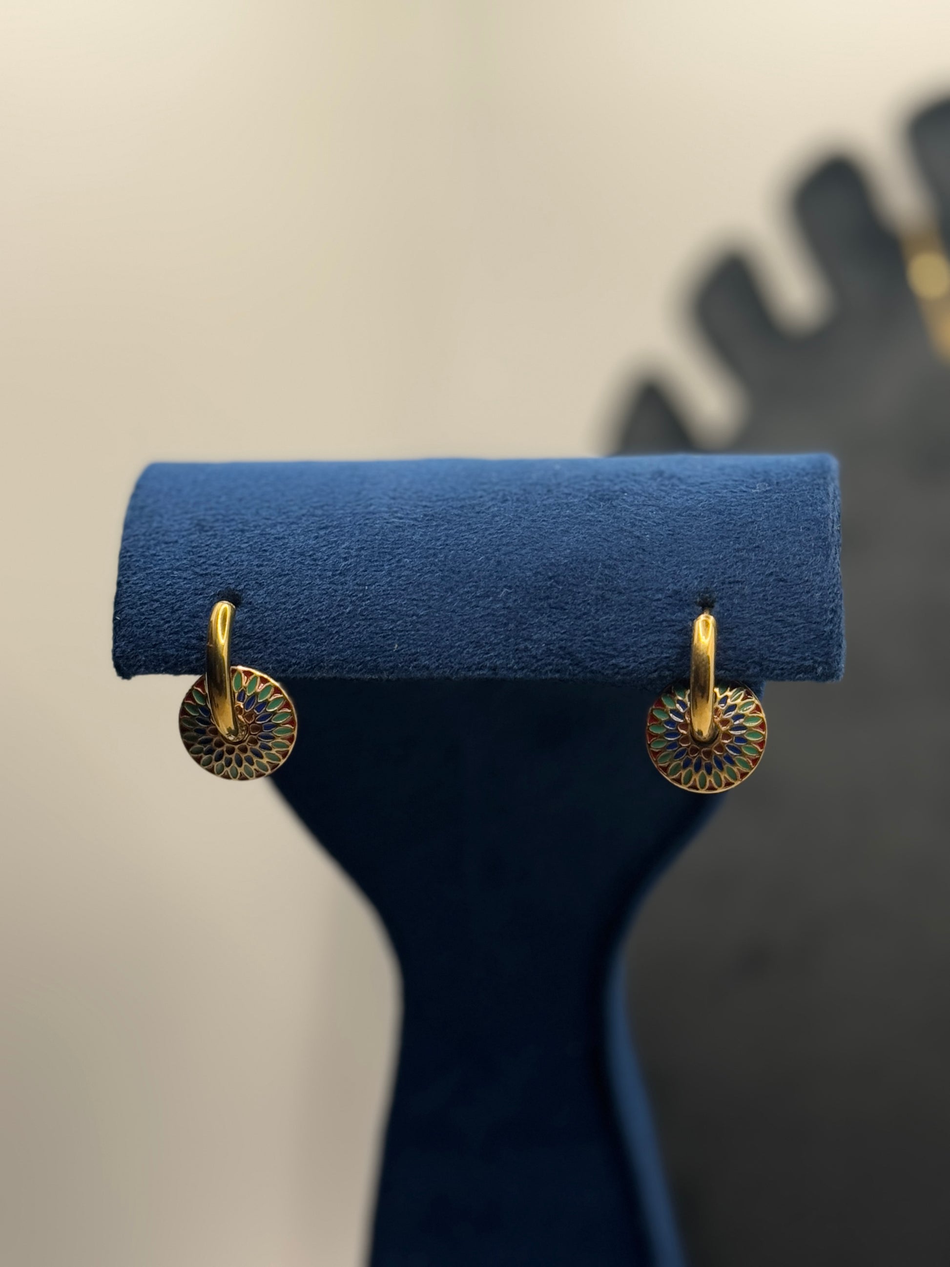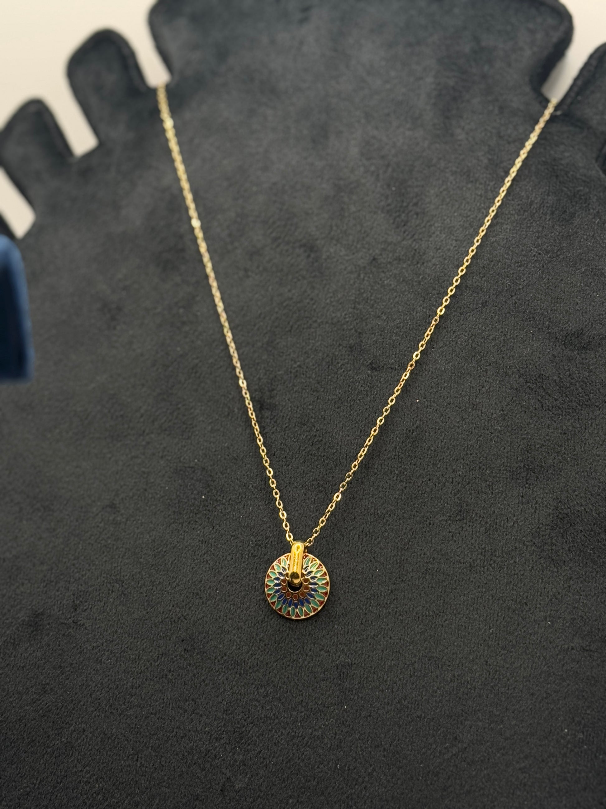 A beautifully coordinated jewelry set featuring a delicate gold chain necklace with a circular, ornate medallion pendant, accompanied by matching gold hoop earrings with similar detailing.