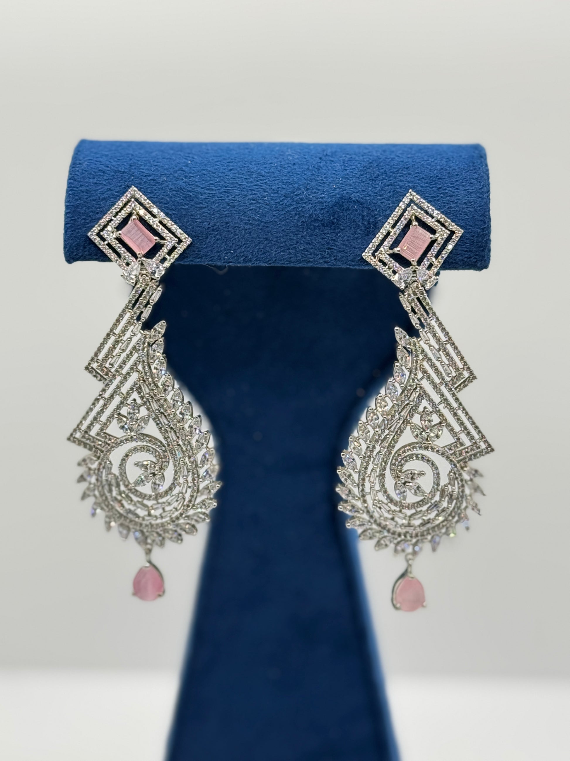 Elaborate drop earrings with a contemporary design, showcasing intricate silver-tone filigree, sparkling clear stones, and elegant pink gemstone drops, presented on a blue velvet display.
