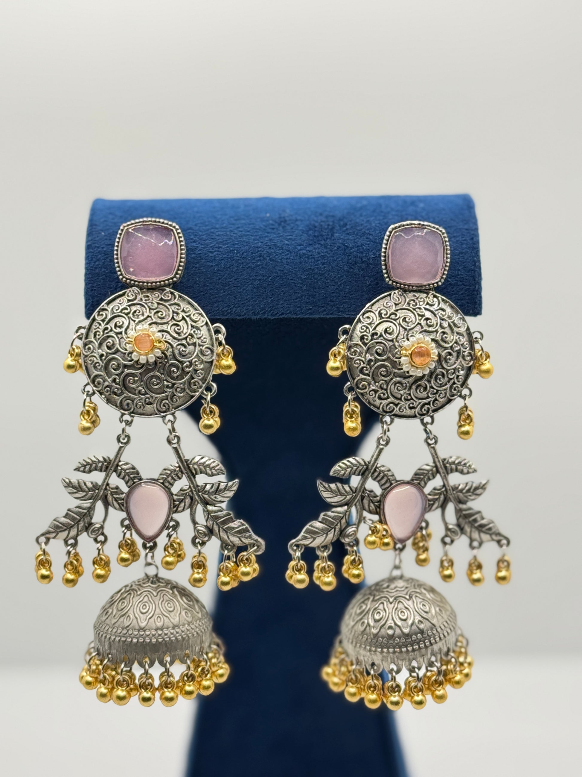 Pink Stone Oxidised Leaf Motif Jhumkas