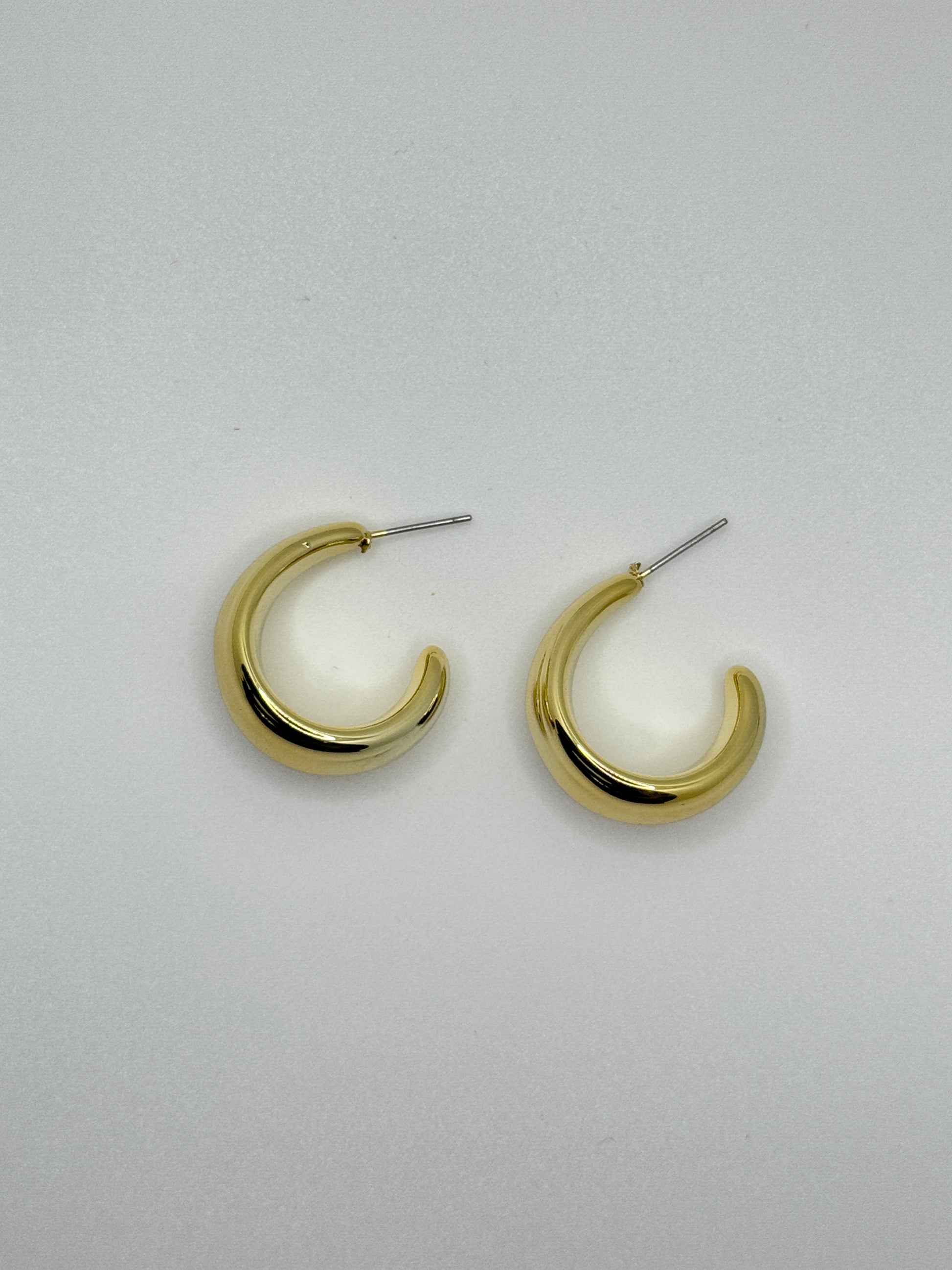 - A single, smooth, and highly polished gold-toned teardrop-shaped earring, showcased on a navy blue velvet-like earring stand.