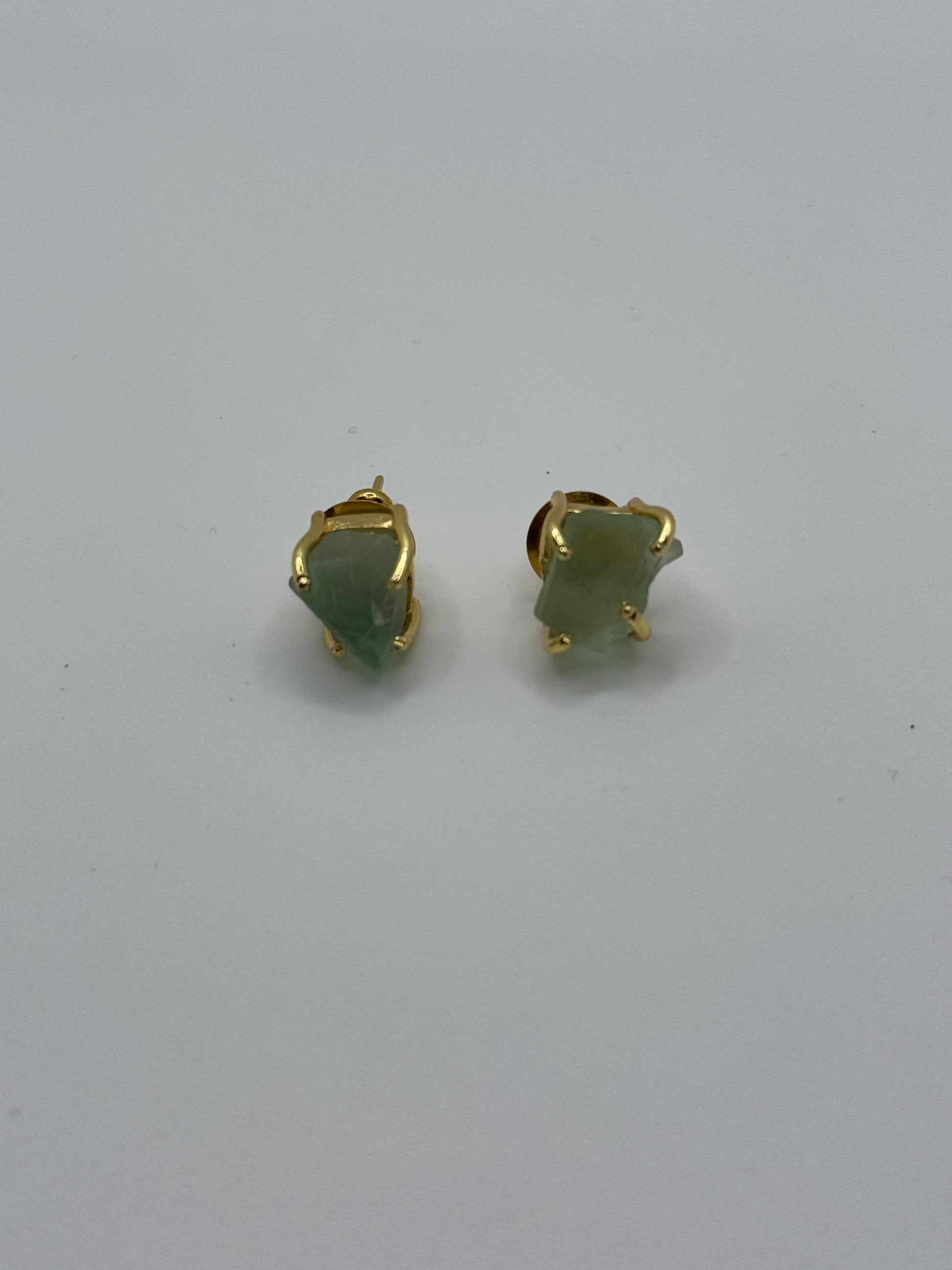 Discover the earthy charm of these stud earrings, featuring raw, unpolished green aventurine gemstones. Each stone displays its unique natural shape and a soothing green hue, securely held by gleaming gold-tone prong settings. These earrings are a perfect blend of natural beauty and understated elegance, ideal for adding a touch of organic sophistication to your look.