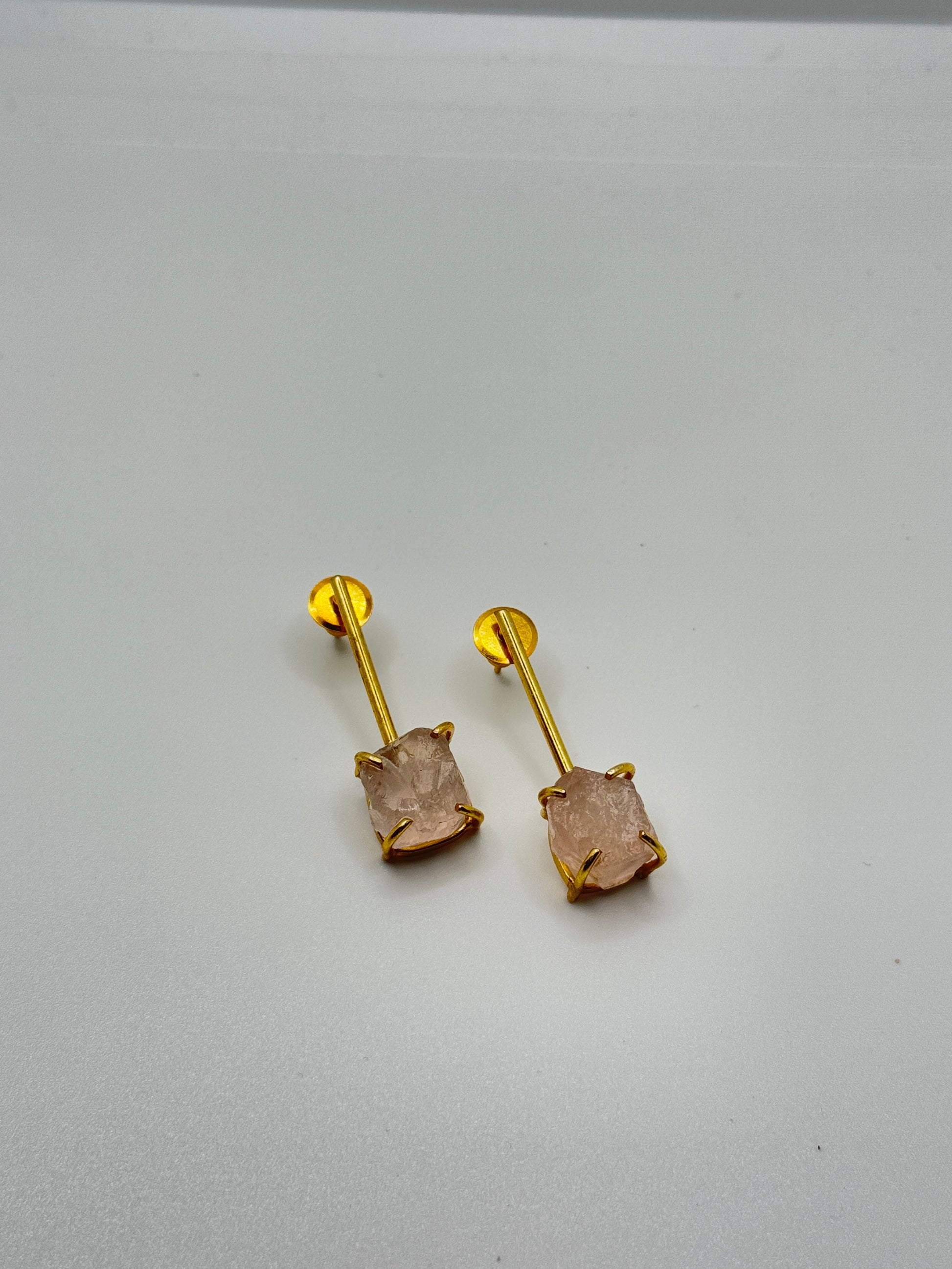 - A pair of minimalist gold drop earrings featuring raw, unpolished rose quartz stones set in a simple gold claw setting, displayed against a white background with a black card.