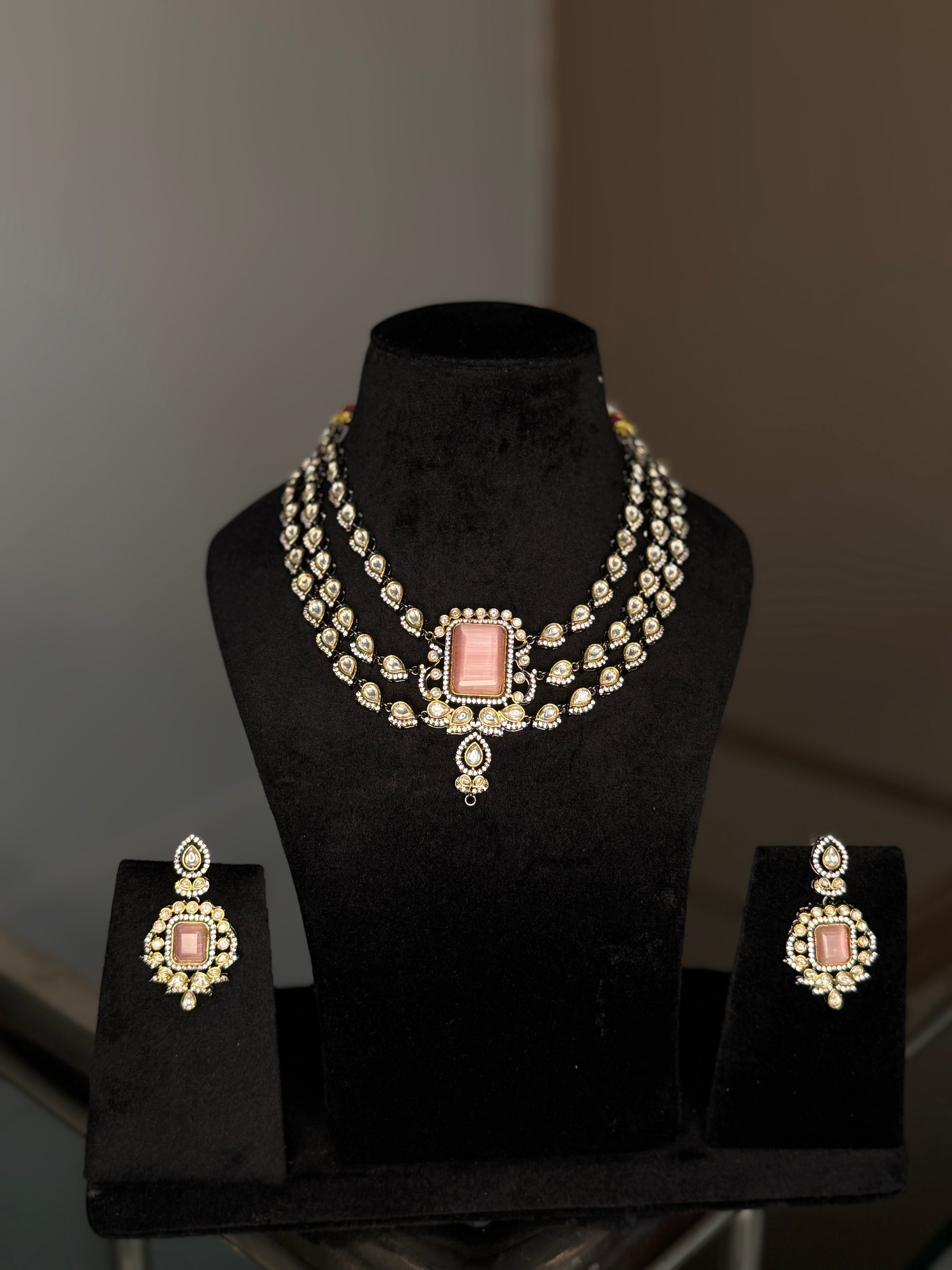 This stunning polki kundan necklace set features multiple layers of intricate detailing, culminating in a striking central pendant adorned with a beautiful rectangular pink stone. The set is completed with perfectly matching earrings, exuding royal elegance