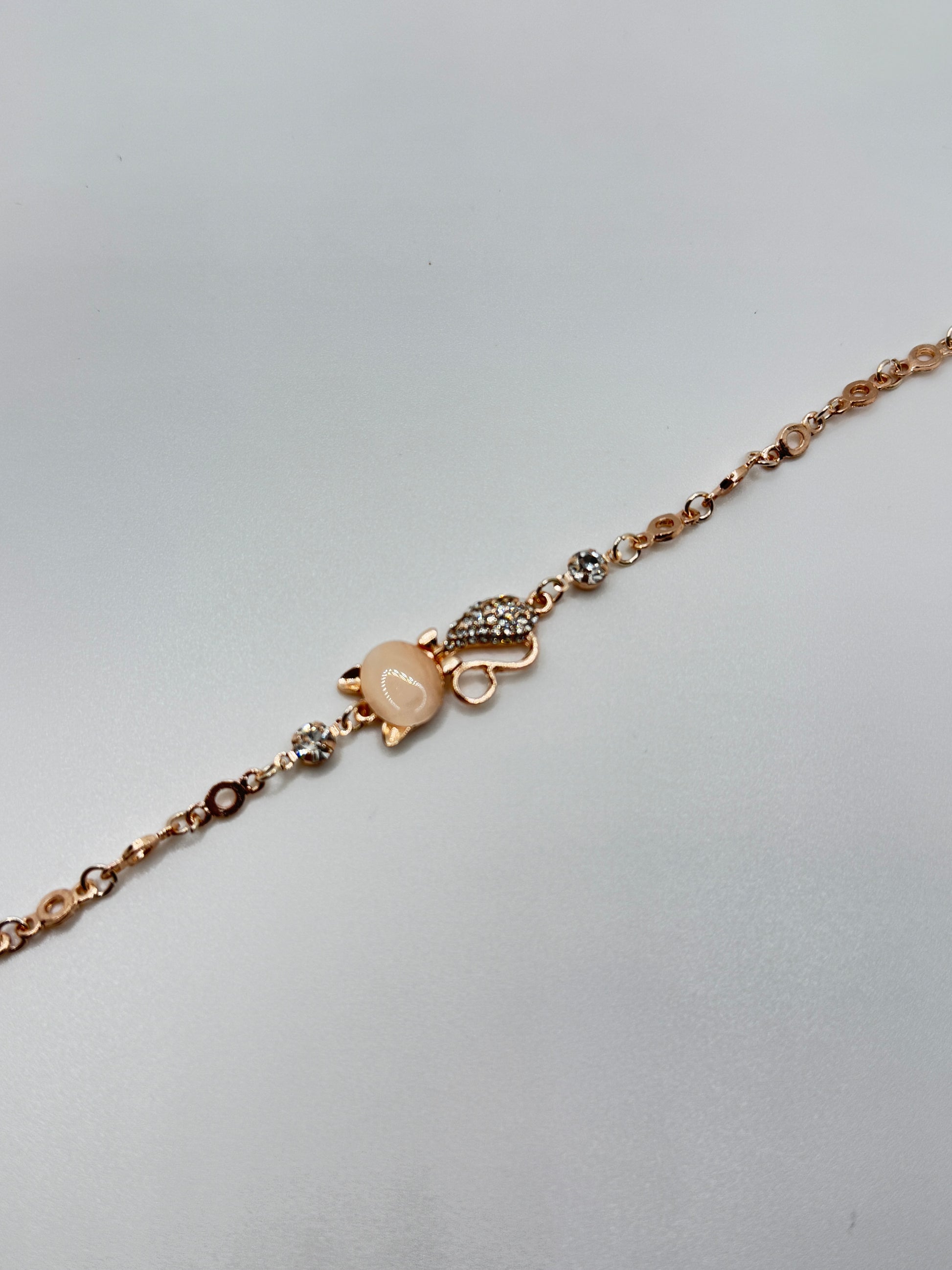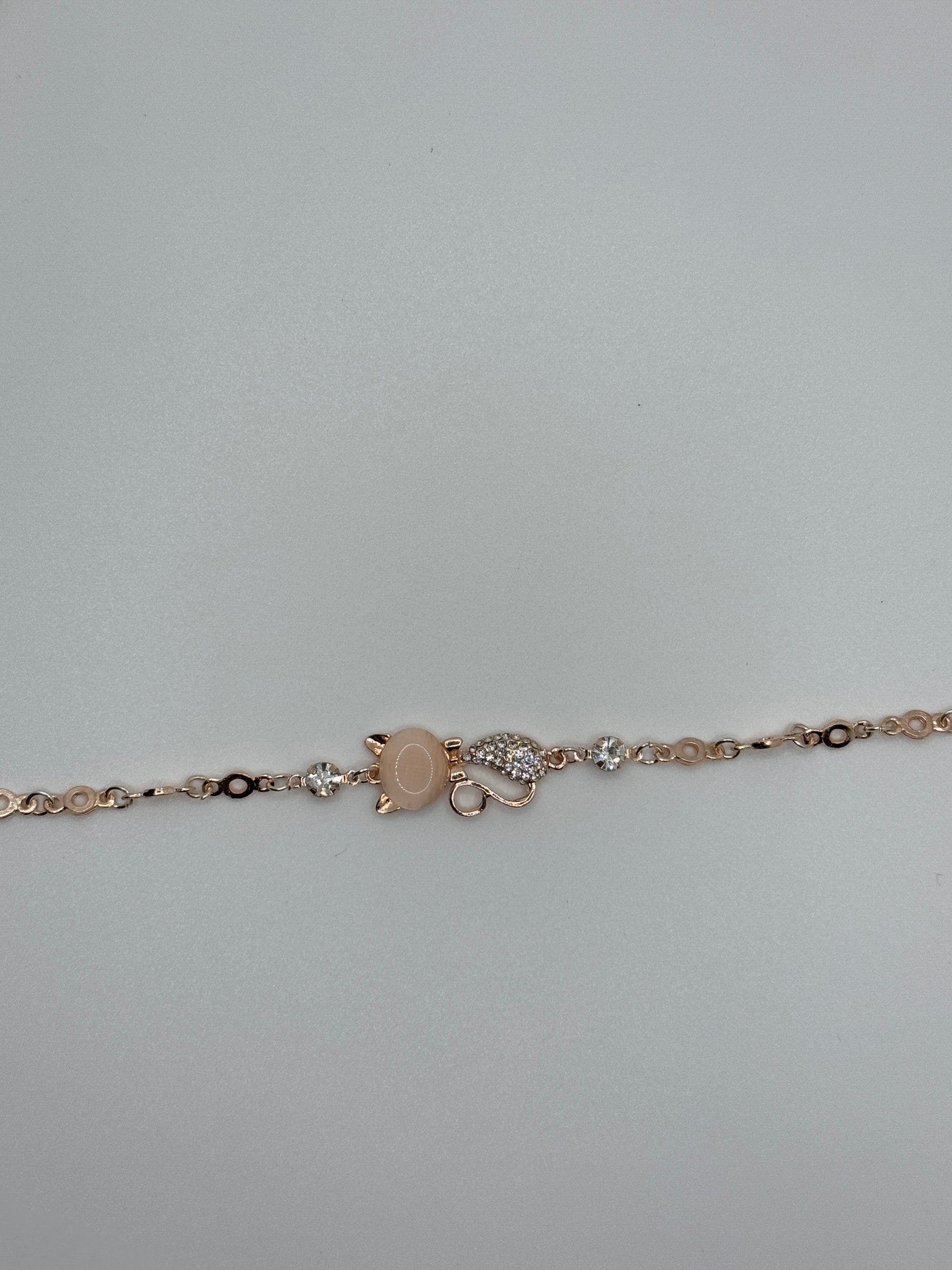 A delicate rose gold-tone ankle bracelet featuring an adorable cat-shaped centerpiece, embellished with sparkling cubic zirconia stones. This charming and elegant piece adds a subtle shimmer to your ankle.