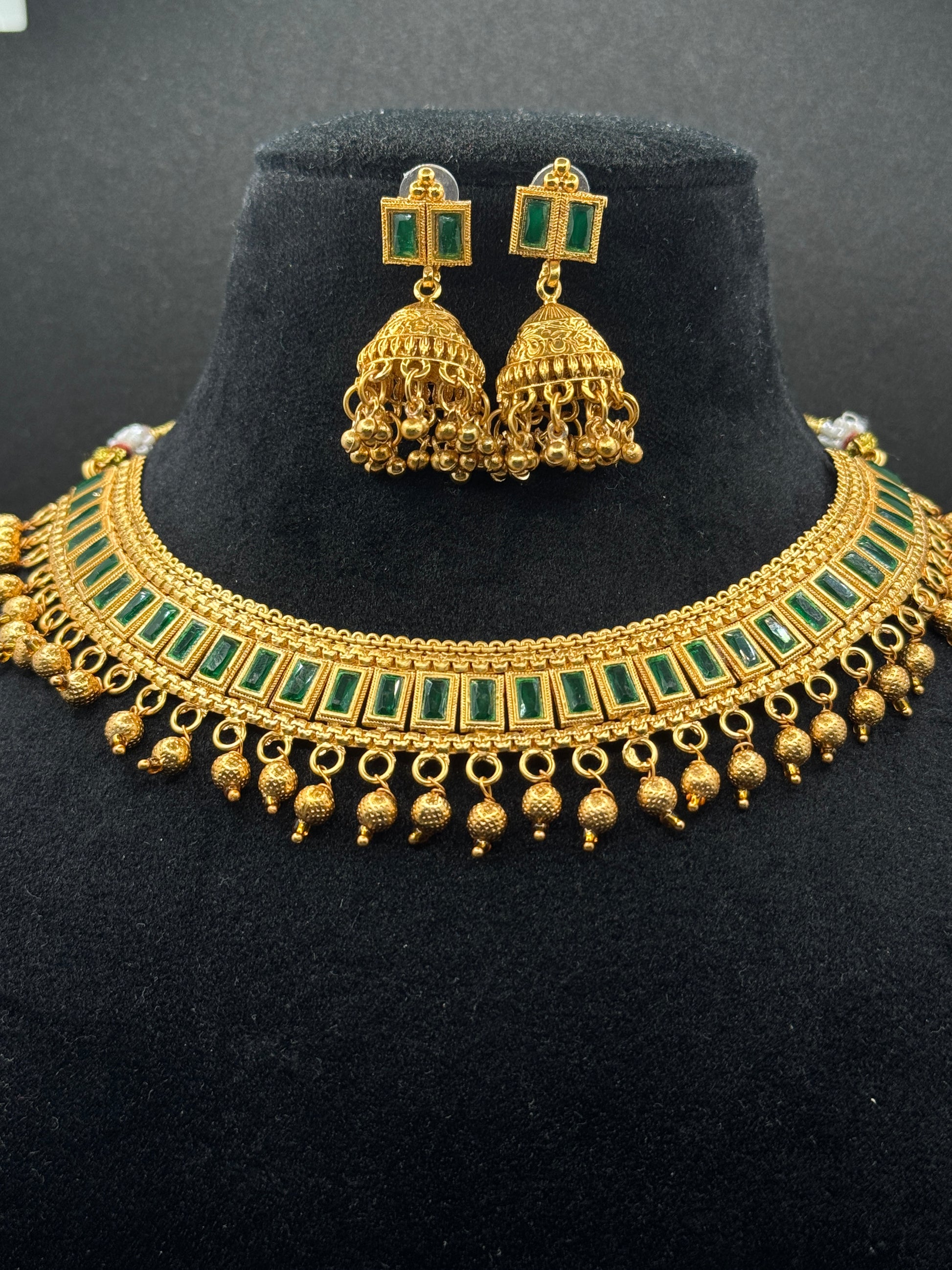 A stunning gold-plated necklace set featuring rich green stones in a classic South Indian design. The matching Jhumka earrings with intricate detailing add a touch of traditional charm, perfect for ethnic wear.