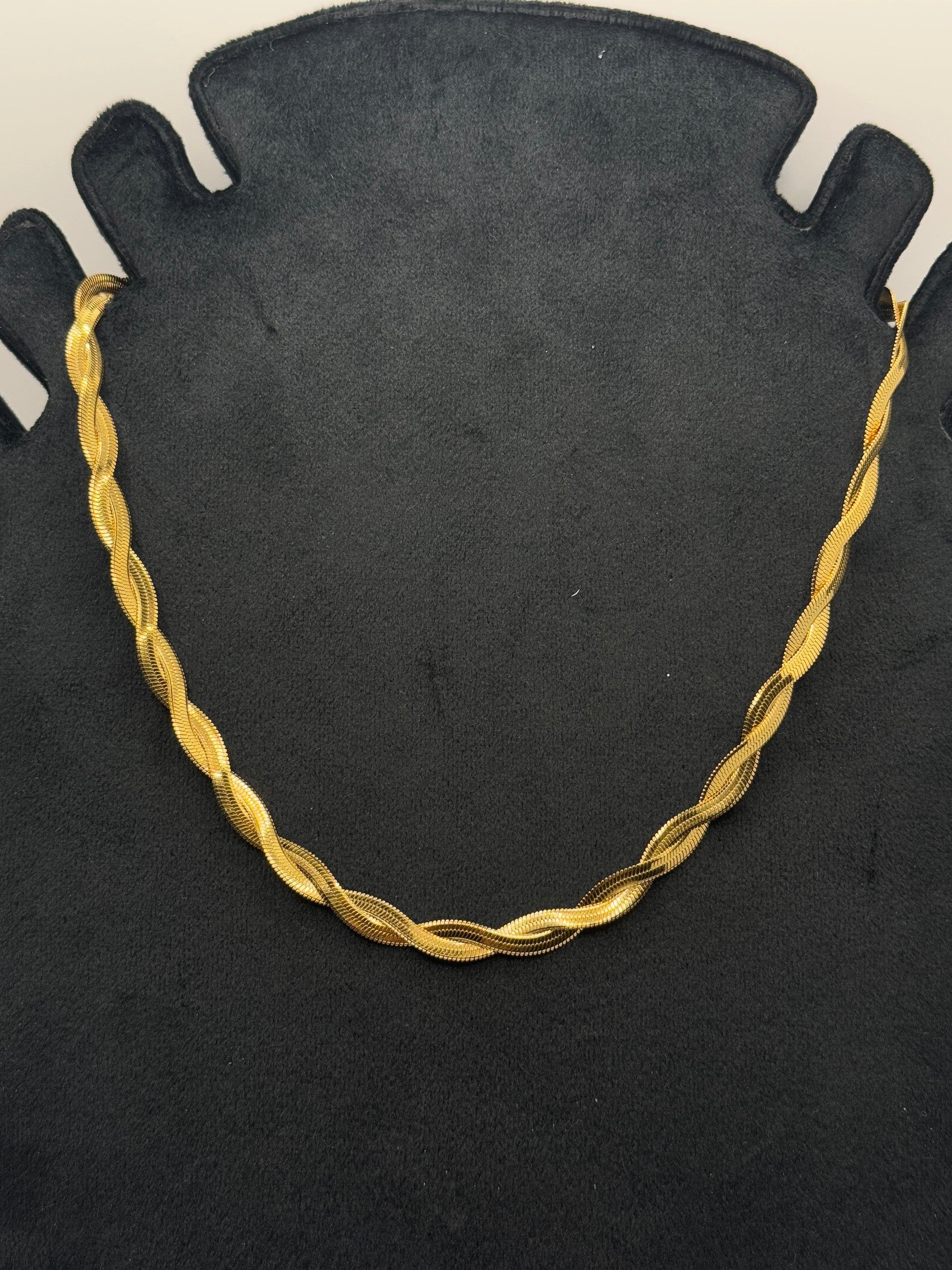A chic gold-toned necklace featuring a unique braided design, combining multiple herringbone chains to create a visually appealing and substantial piece.
