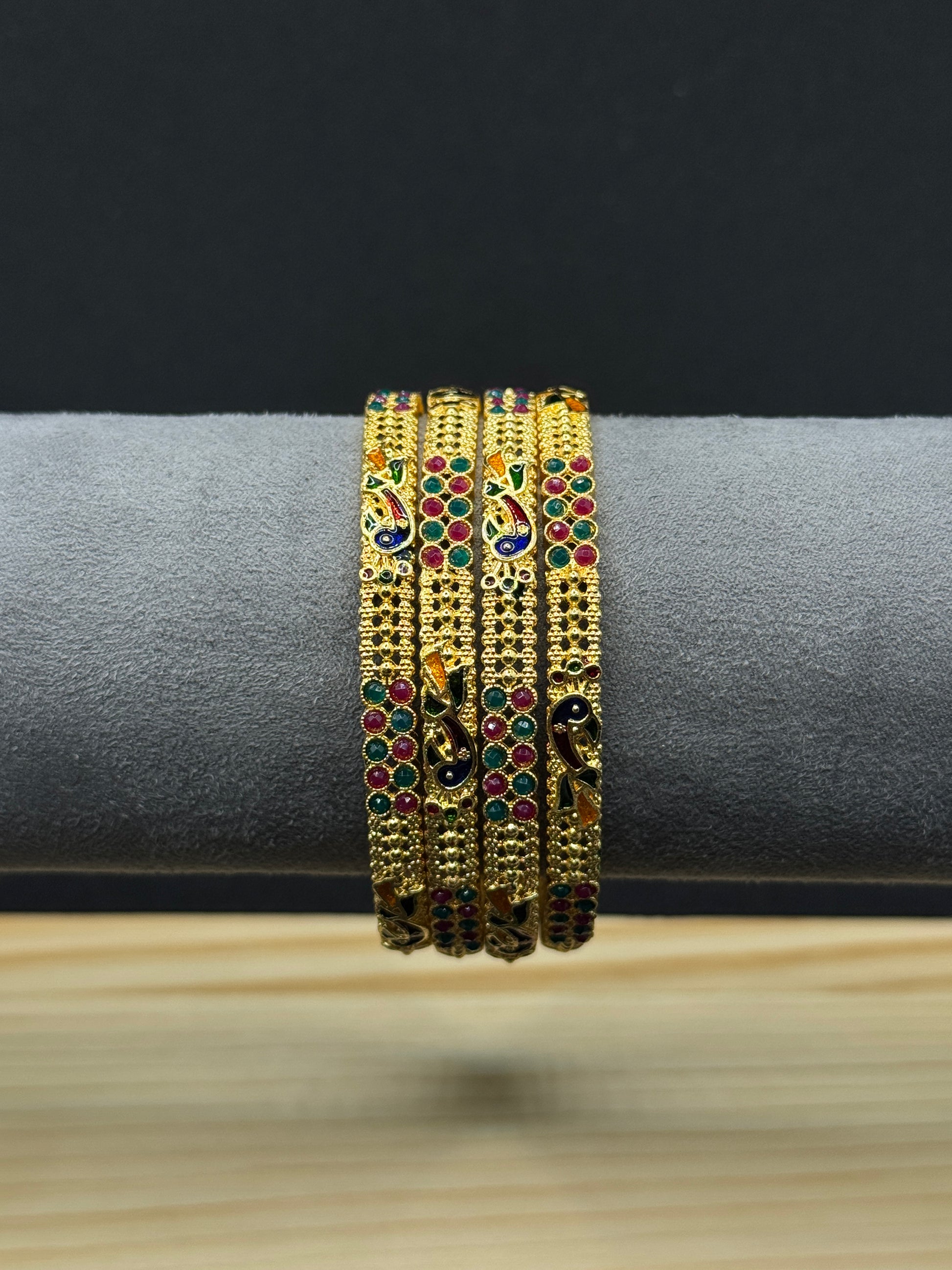 A stunning set of four gold-plated bangles, intricately designed with colorful enamel work in traditional peacock and floral motifs, embellished with ruby and emerald-colored stones.