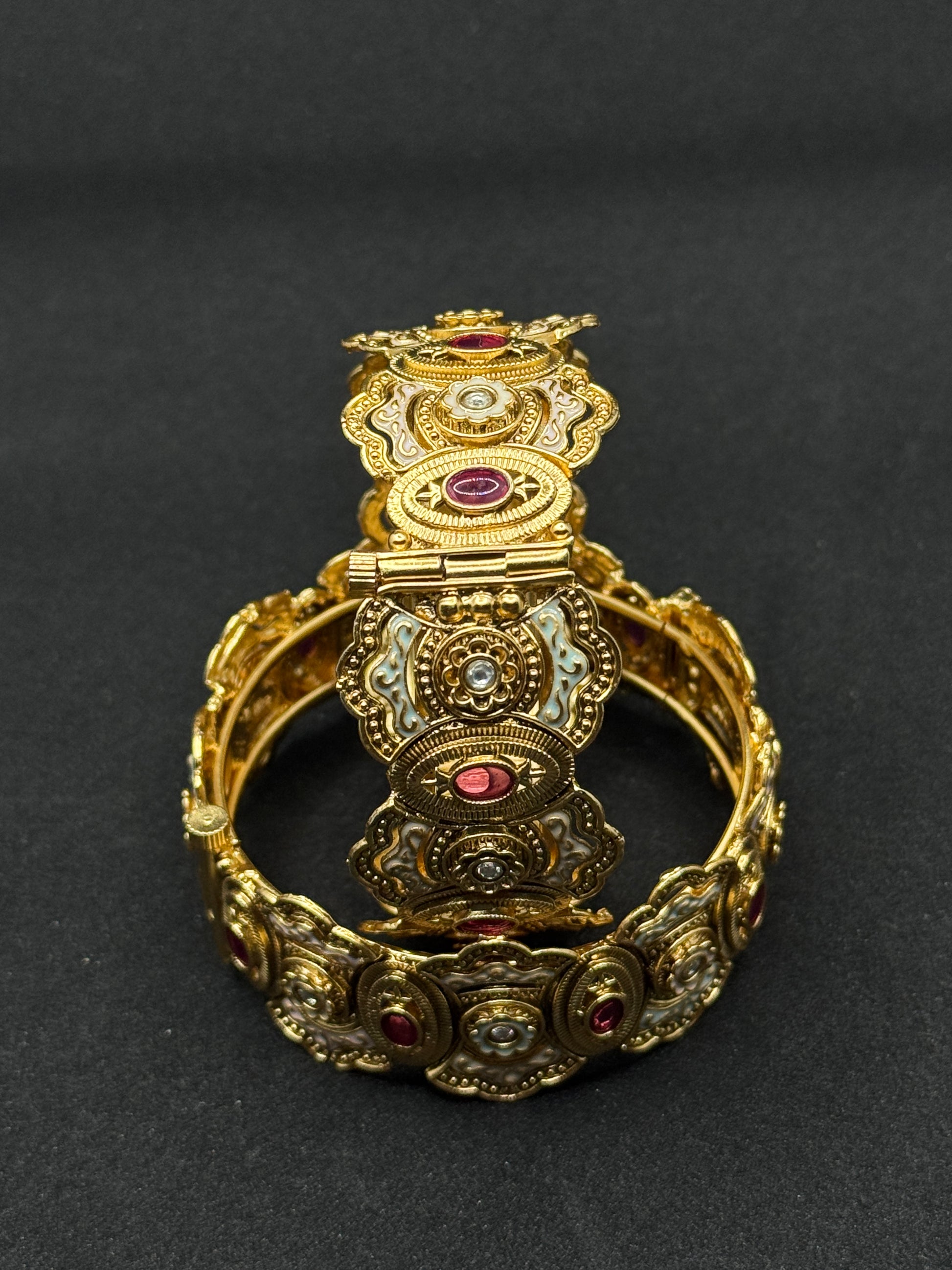 A magnificent set of gold-plated kada bangles, showcasing a detailed Ashtalakshmi design with red and white embellishments, perfect for devotees and those who appreciate traditional Indian jewelry.