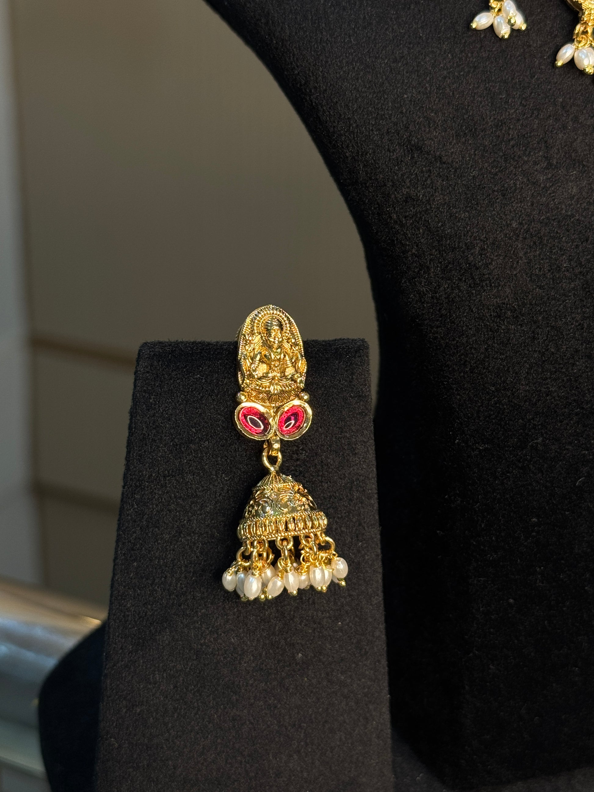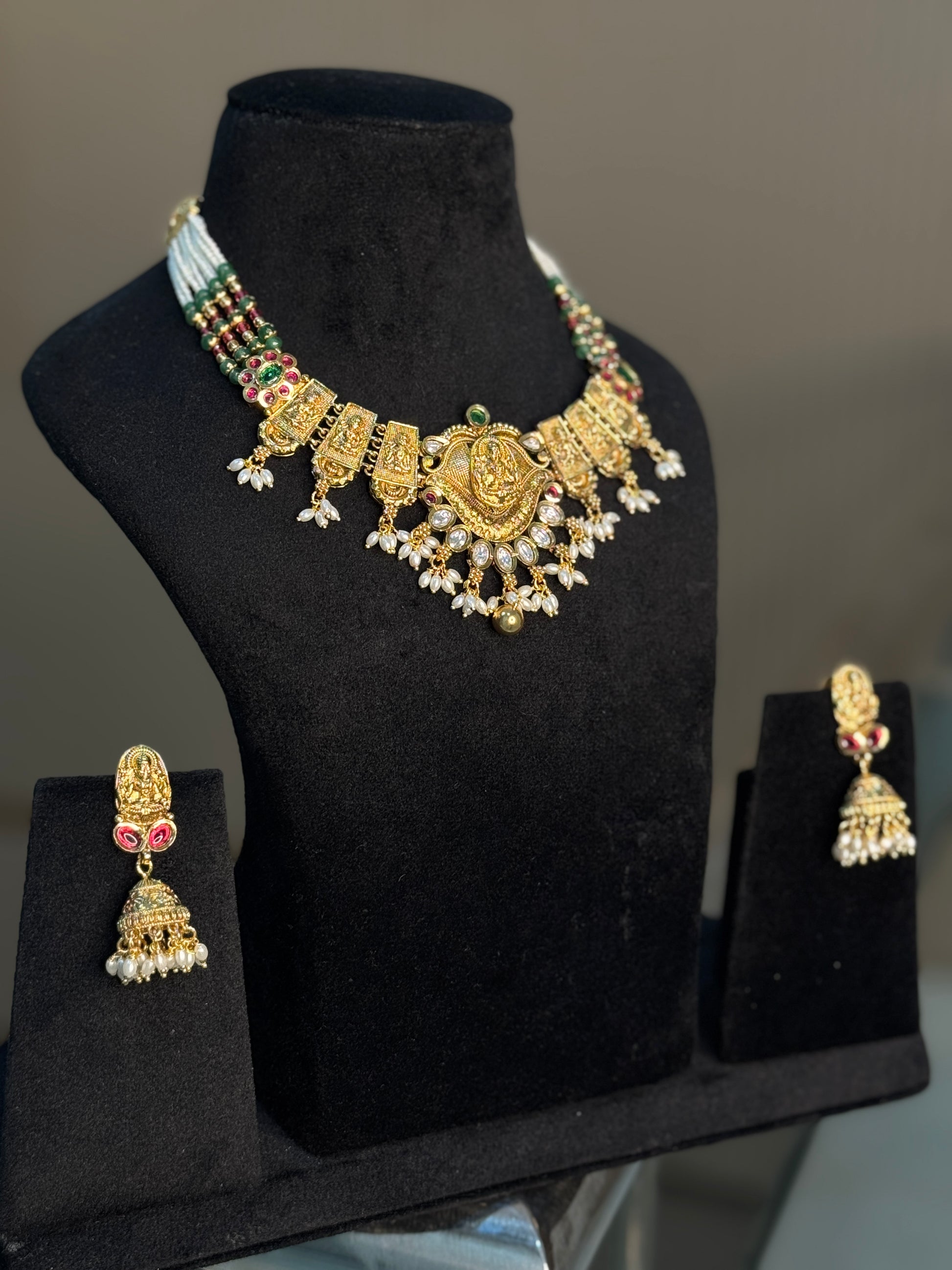 - A beautiful gold-plated necklace set showcasing a central ornate pendant with multi-colored stones (red, green) and delicate pearl drops. The necklace is strung with white and green beads, complemented by traditional jhumka-style earrings with pearl accents. Ideal for bridal or special occasion wear.