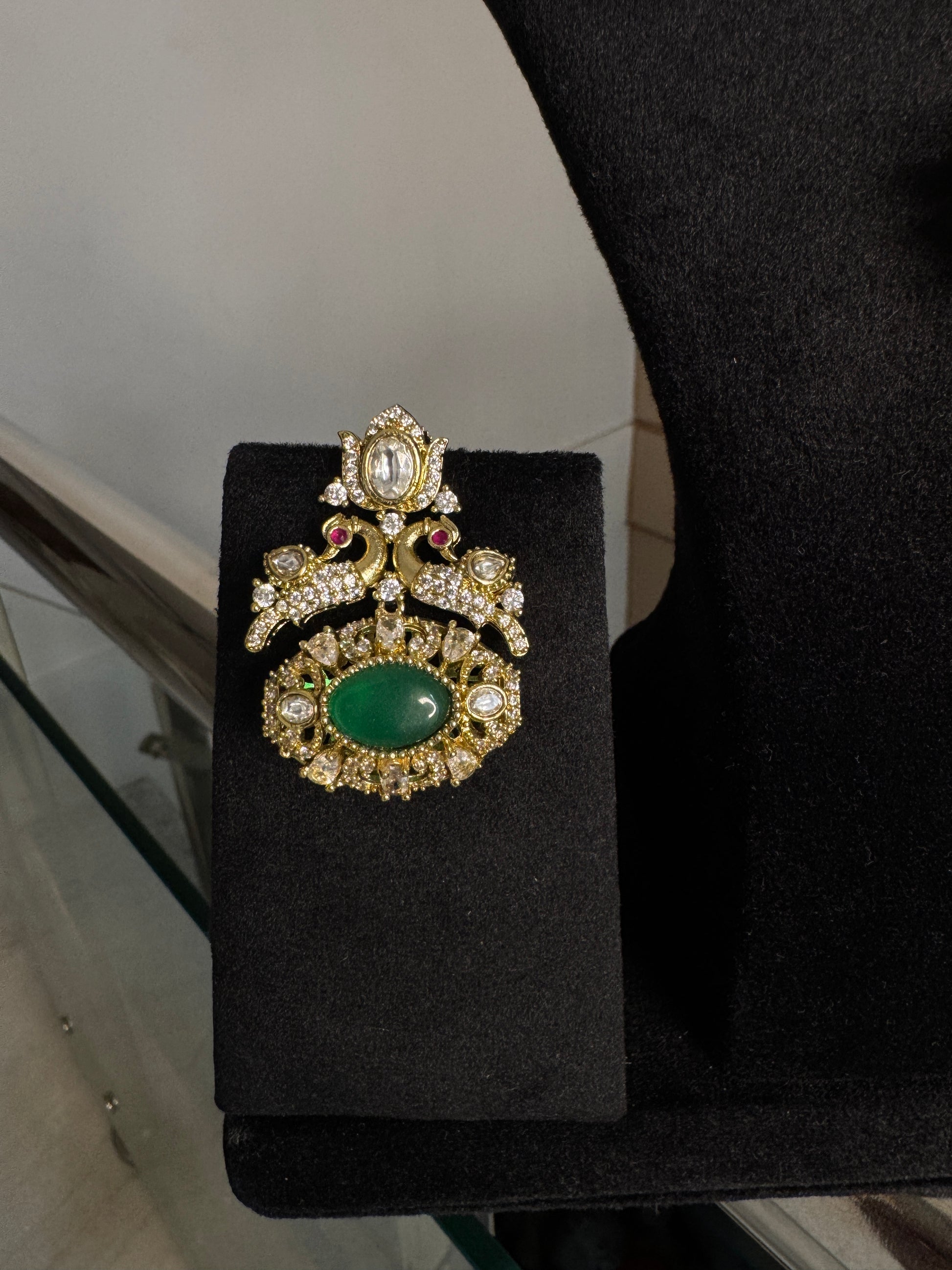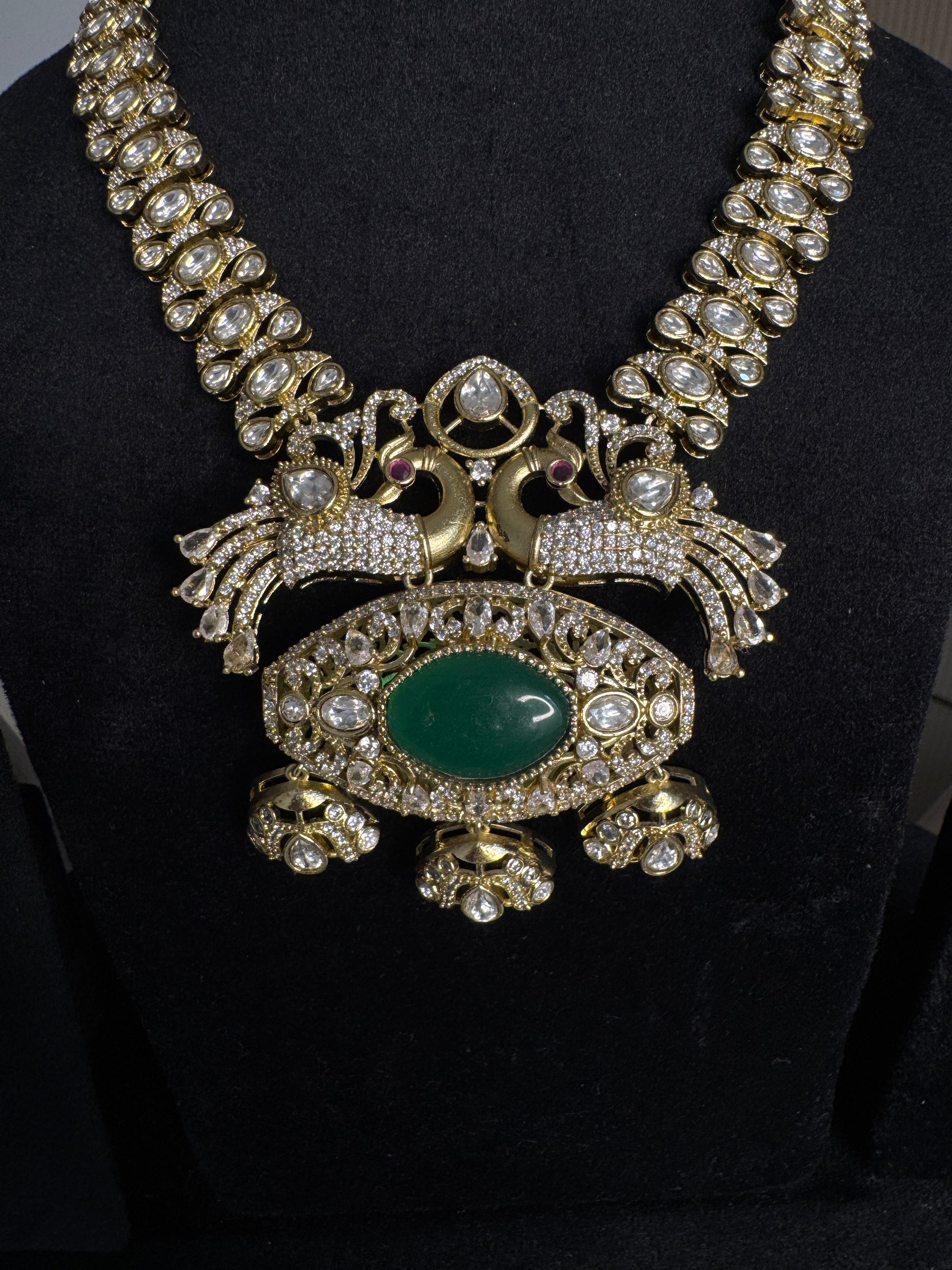 Experience the grandeur of traditional Jadau craftsmanship with this Victorian Kanti necklace set. It features an elaborate central pendant with intricate details and a beautiful green stone, paired with matching earrings for a complete regal look.
