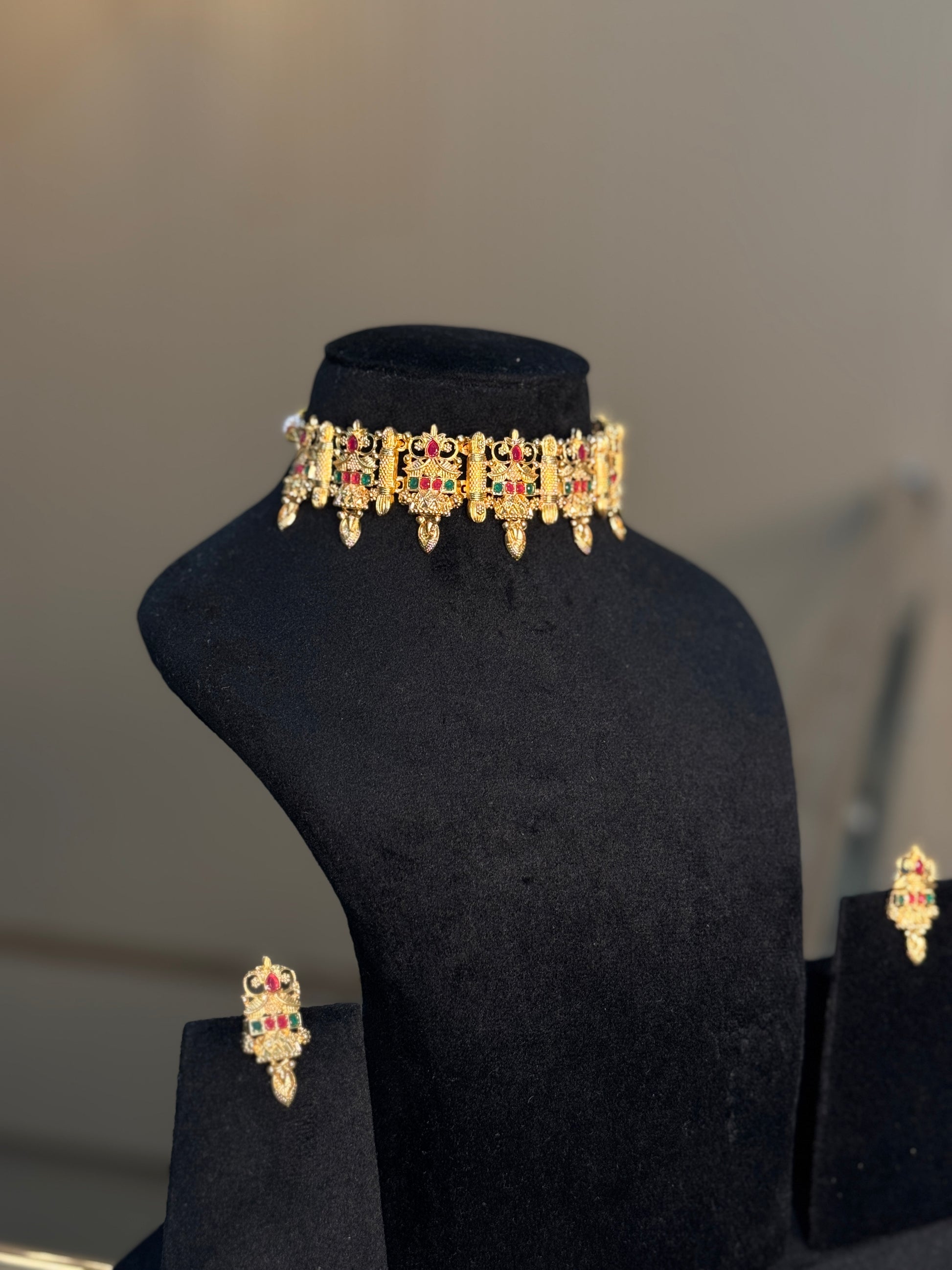 A striking gold-plated choker necklace adorned with a vibrant array of red (ruby) and green (emerald) stones, interspersed with delicate gold beadwork. The set comes with complementing stud earrings, perfect for adding a pop of color and traditional charm to any outfit.