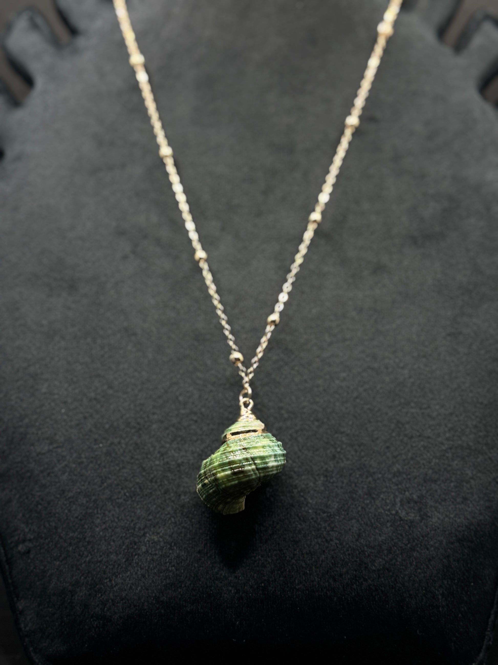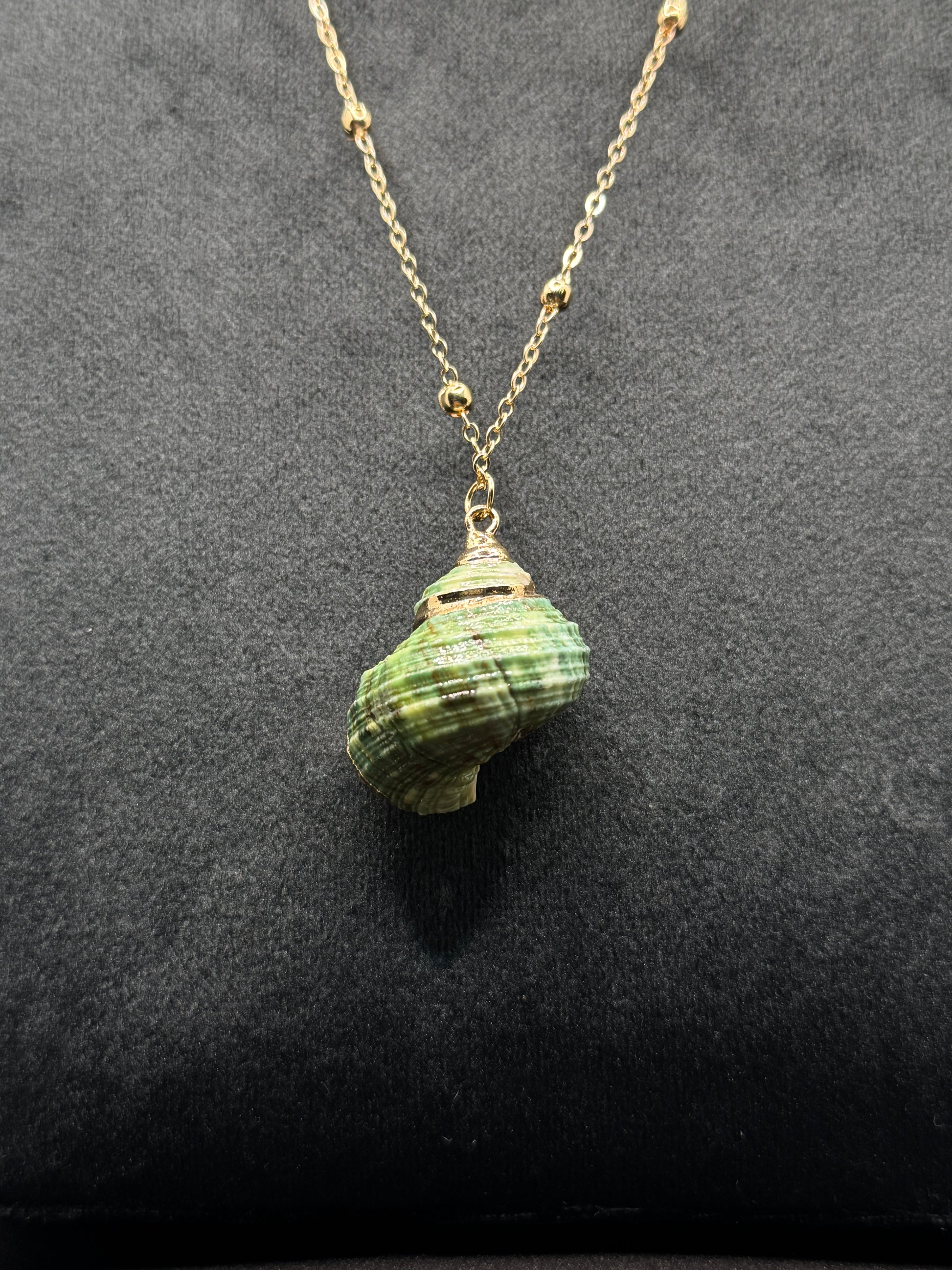 Add a splash of color and natural beauty to your look with this captivating gold-tone necklace, featuring a striking green seashell pendant. The delicate chain is adorned with small, polished beads, providing a subtle shimmer. The focal point is a beautifully crafted seashell, boasting a rich green hue and natural ridges that give it unique character.