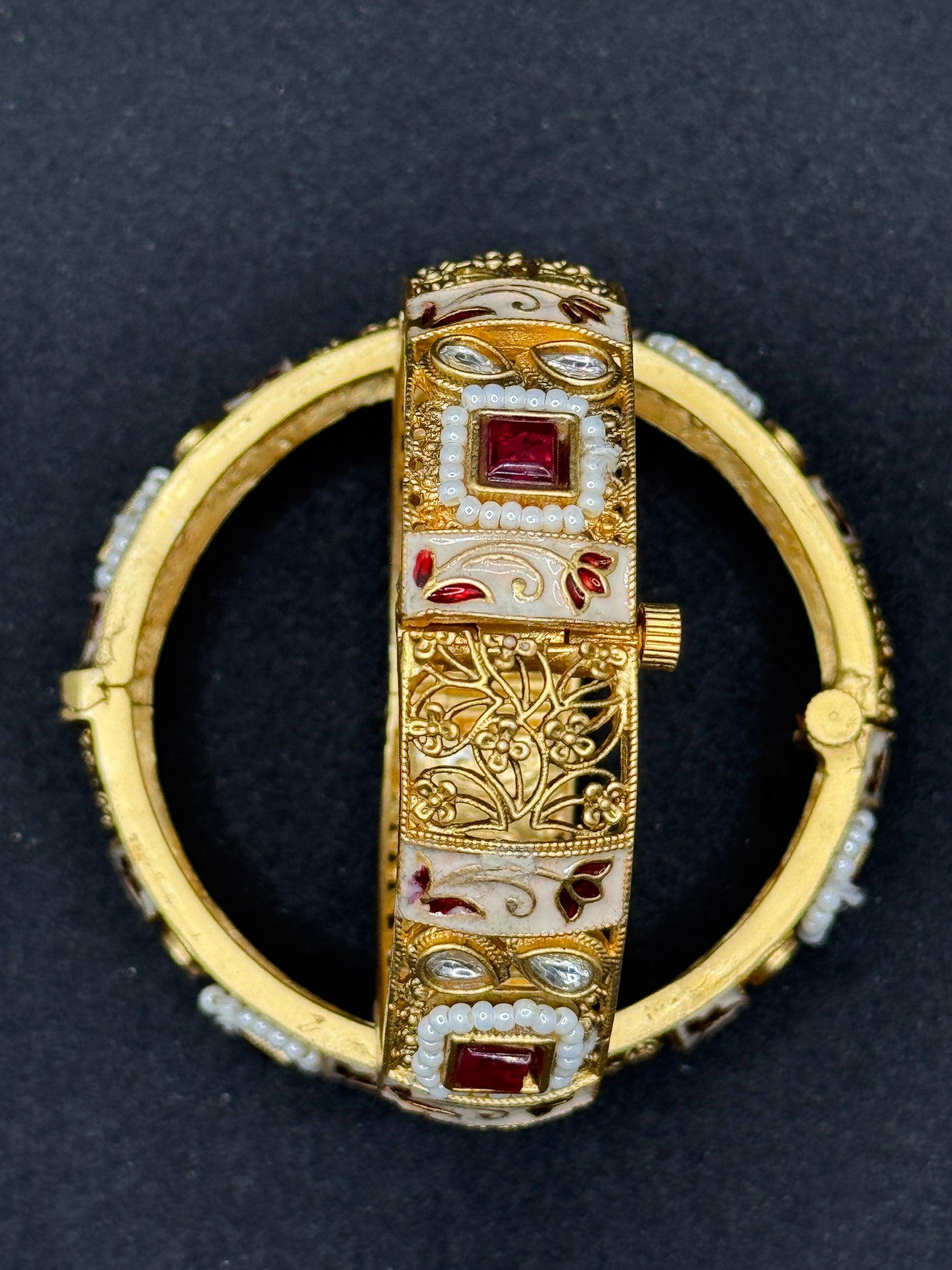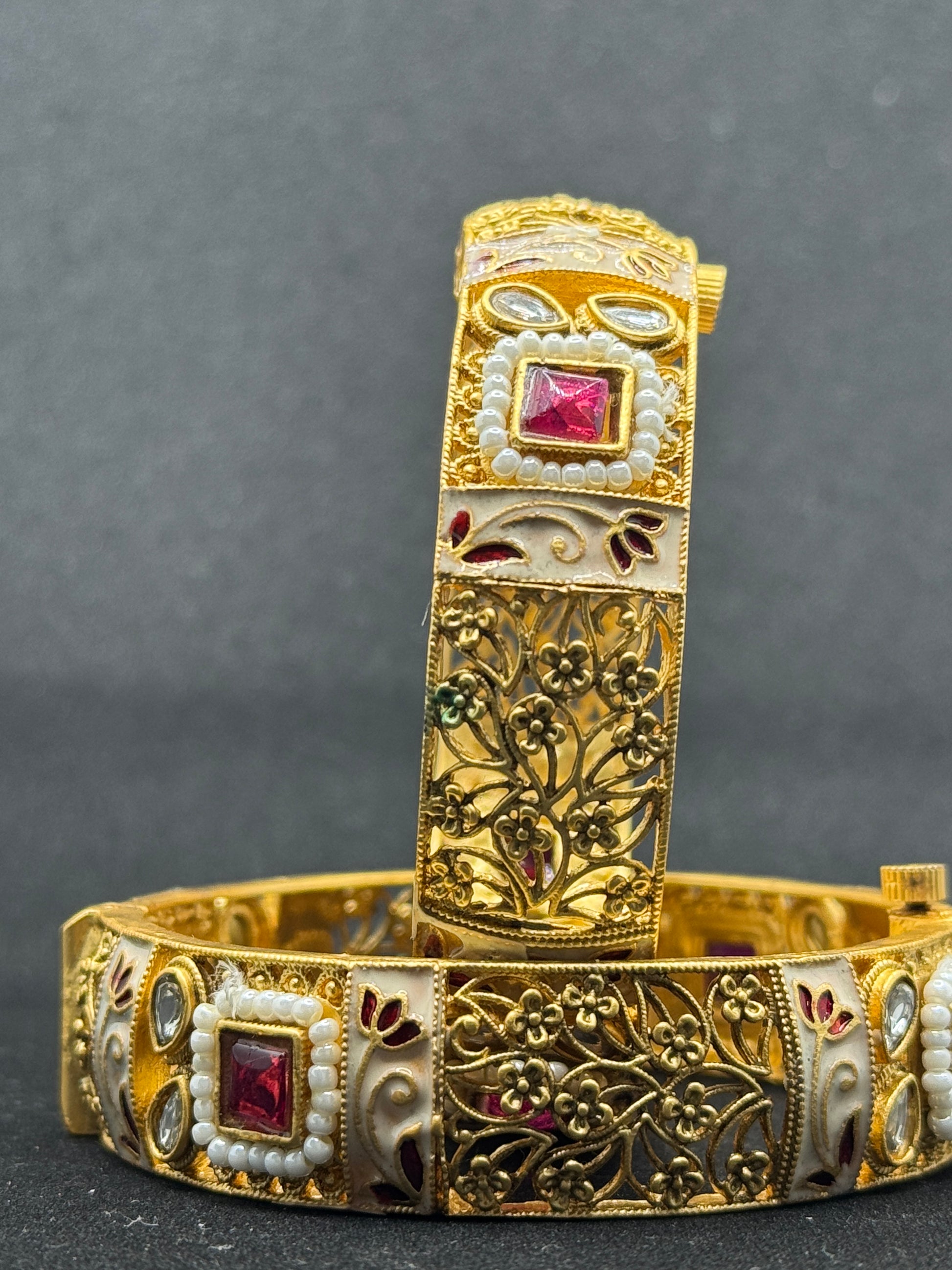 Elegant gold-plated bangles featuring beautiful white Meenakari work, accented with red Polki stones and delicate pearl detailing, combining traditional craftsmanship with a contemporary aesthetic.