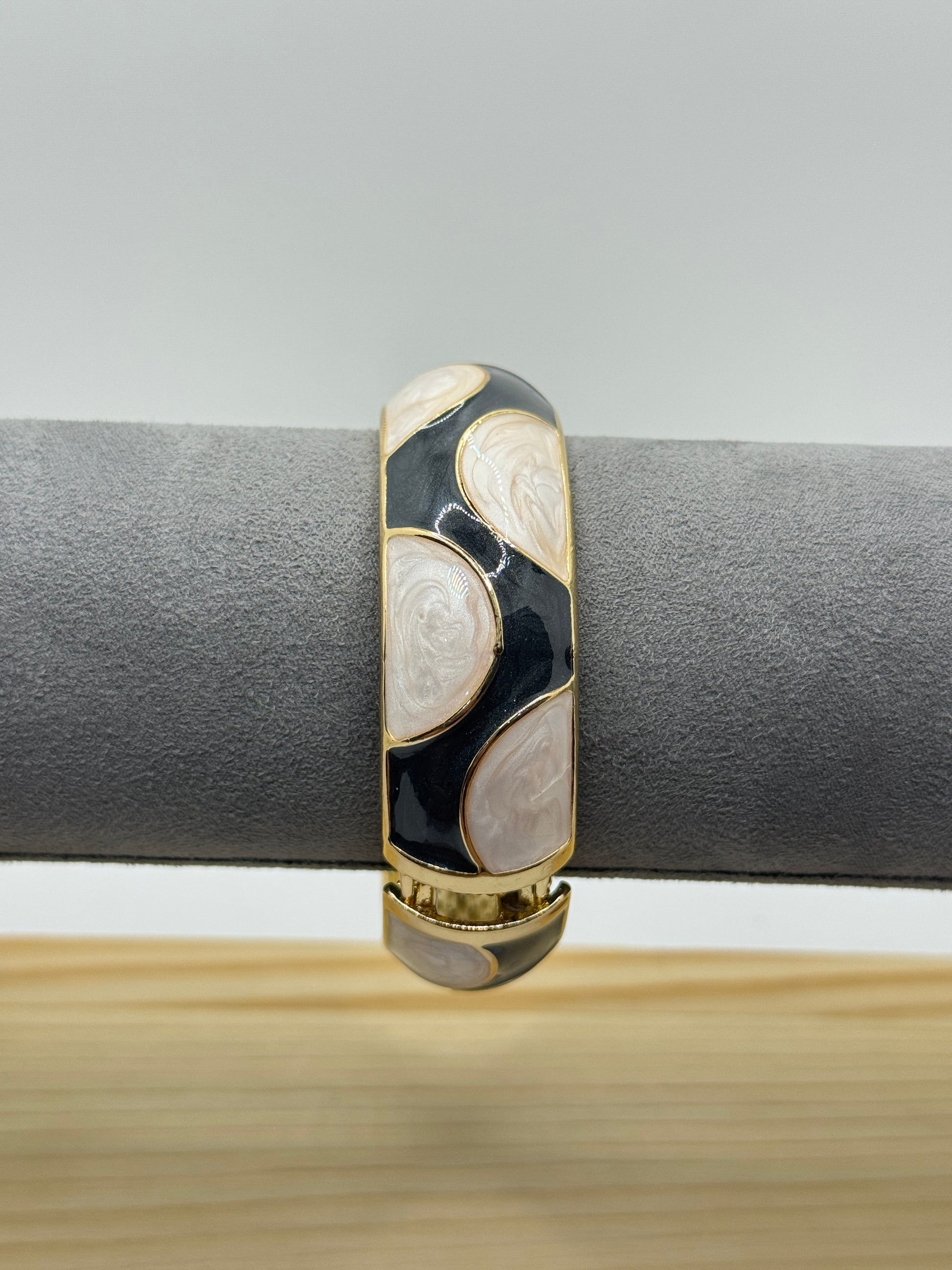 Wide Bangle with Black, White, and Gray Stripes on Gold